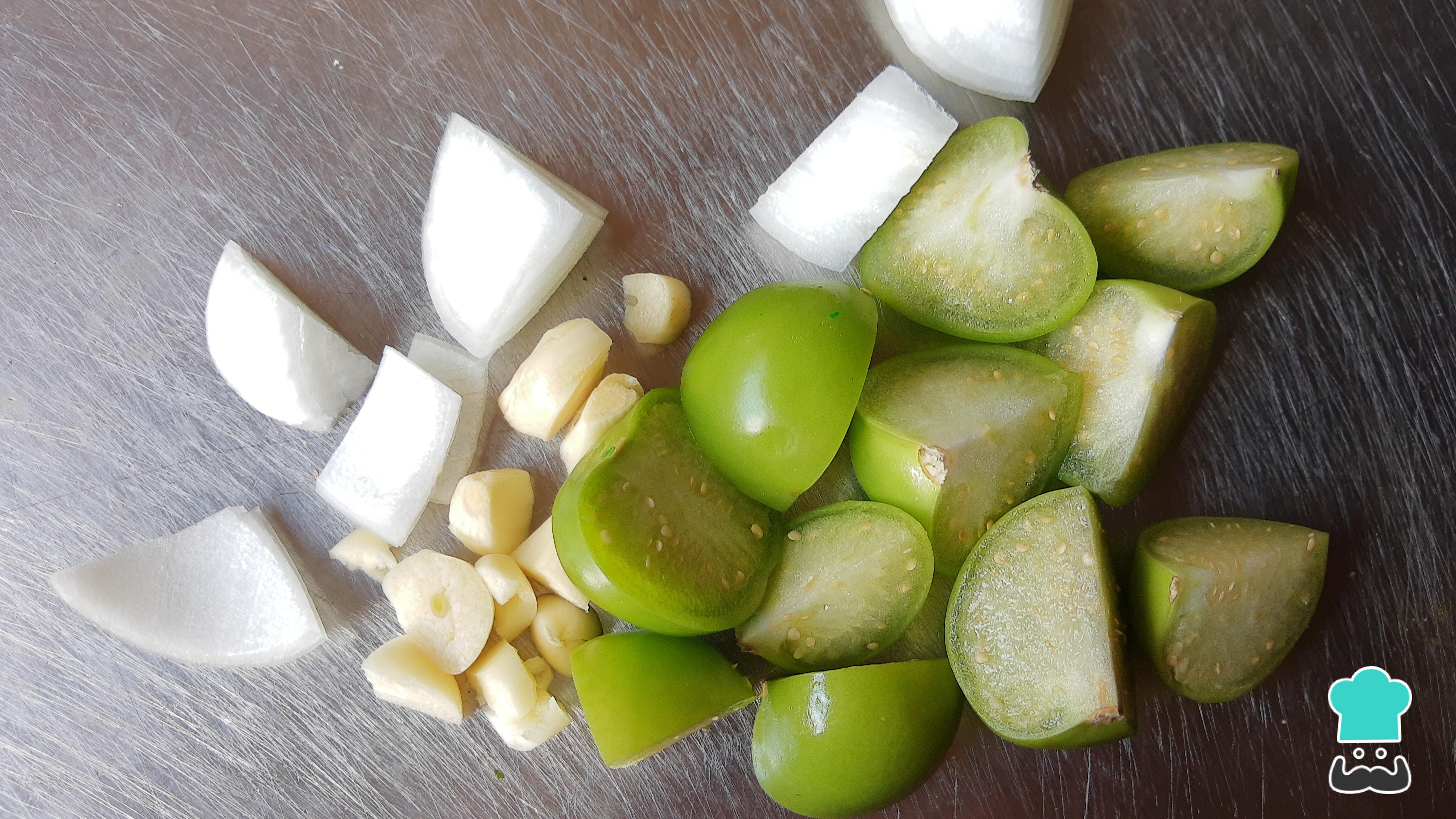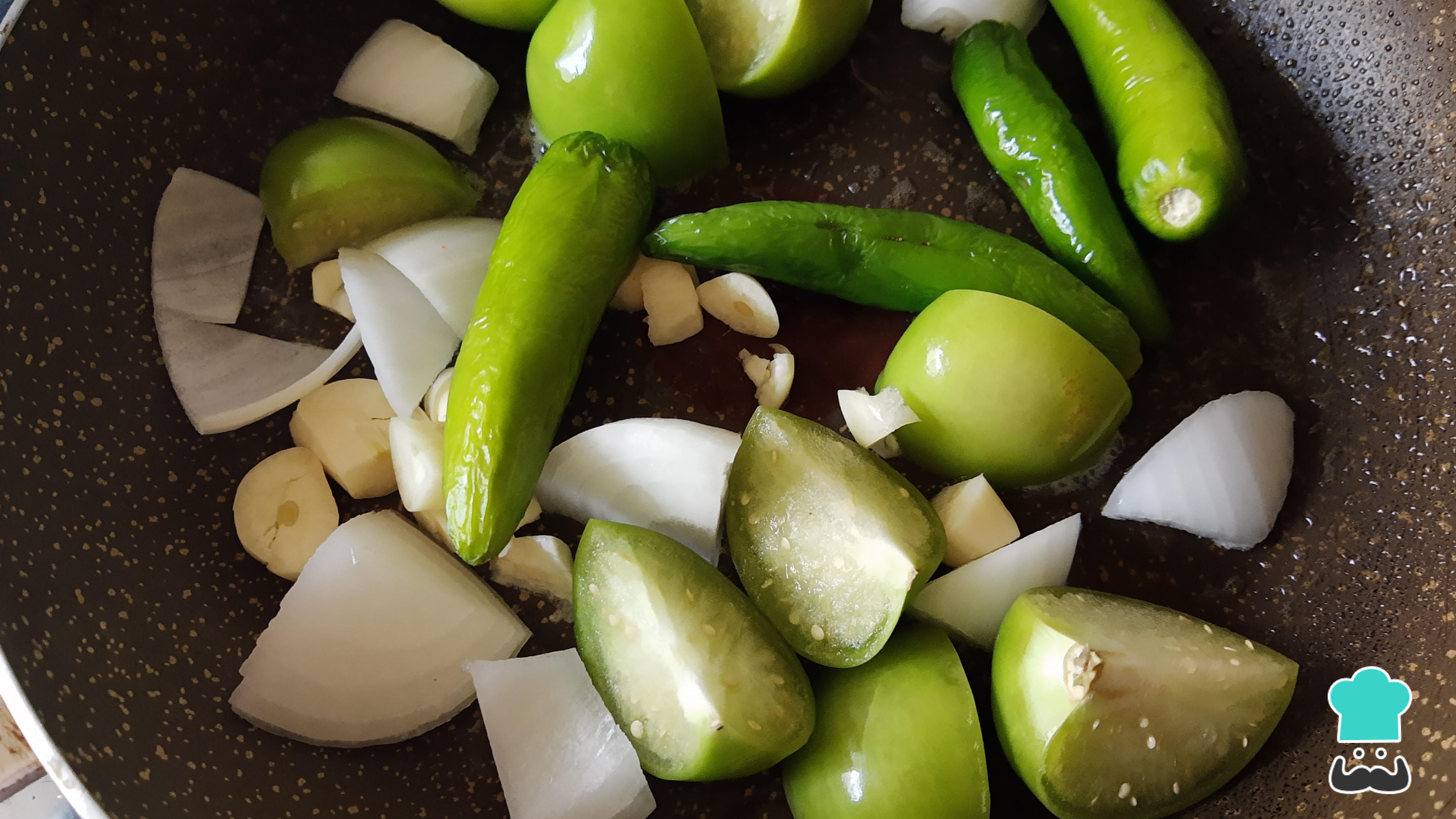 Calienta una cucharadita de aceite en una olla o sartén, agrega los tomates verdes, los dientes de ajo, el trozo de cebolla y los chiles serrano. Deja que frían ligeramente con el aceite a fuego medio-alto por unos 3-5 minutos, dando vueltas constantemente para que no se quemen.