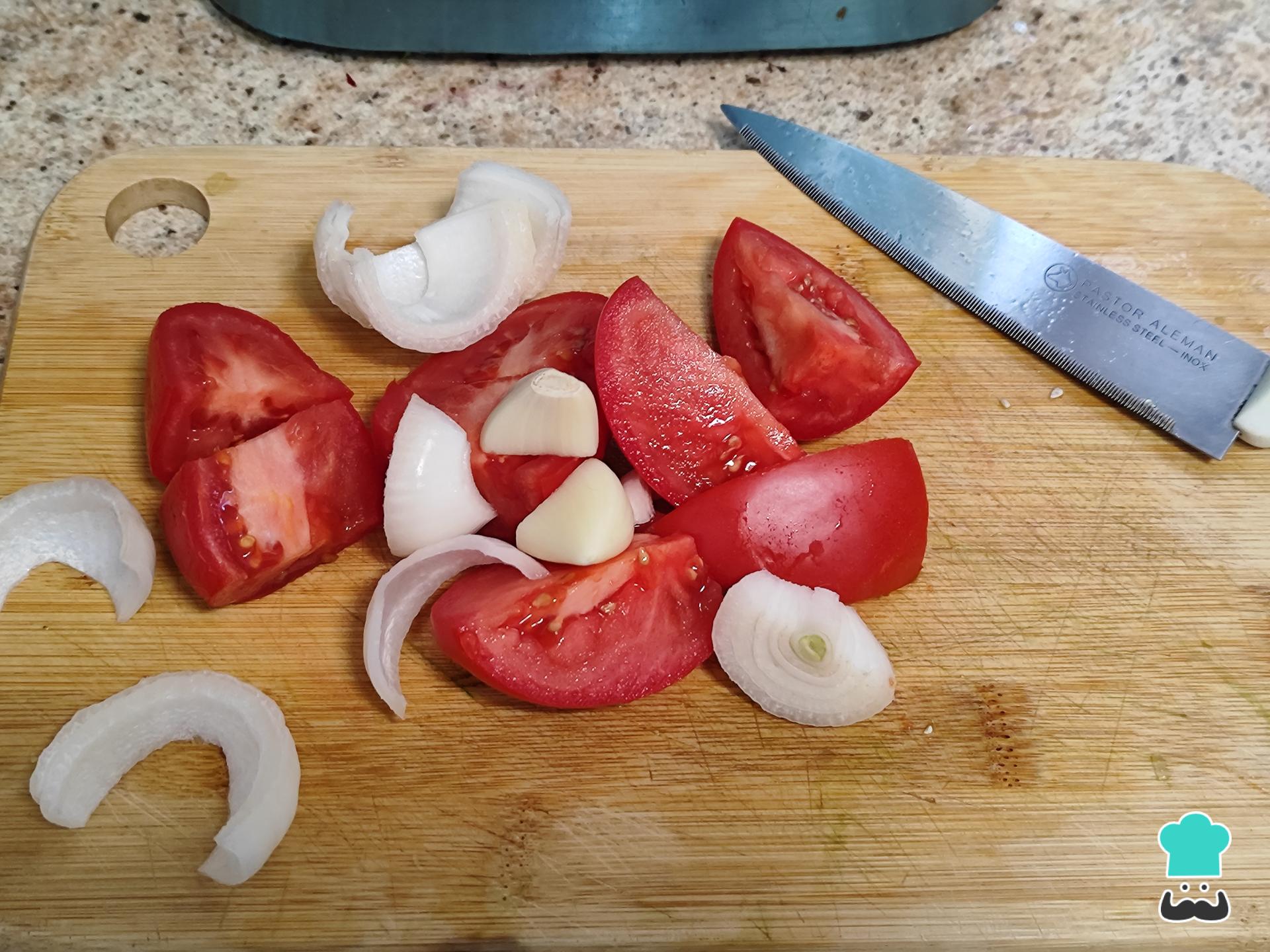 Trocea la cebolla, el tomate y el diente de ajo para facilitar su asado; estos ingredientes aportarán textura y sabor a la salsa.