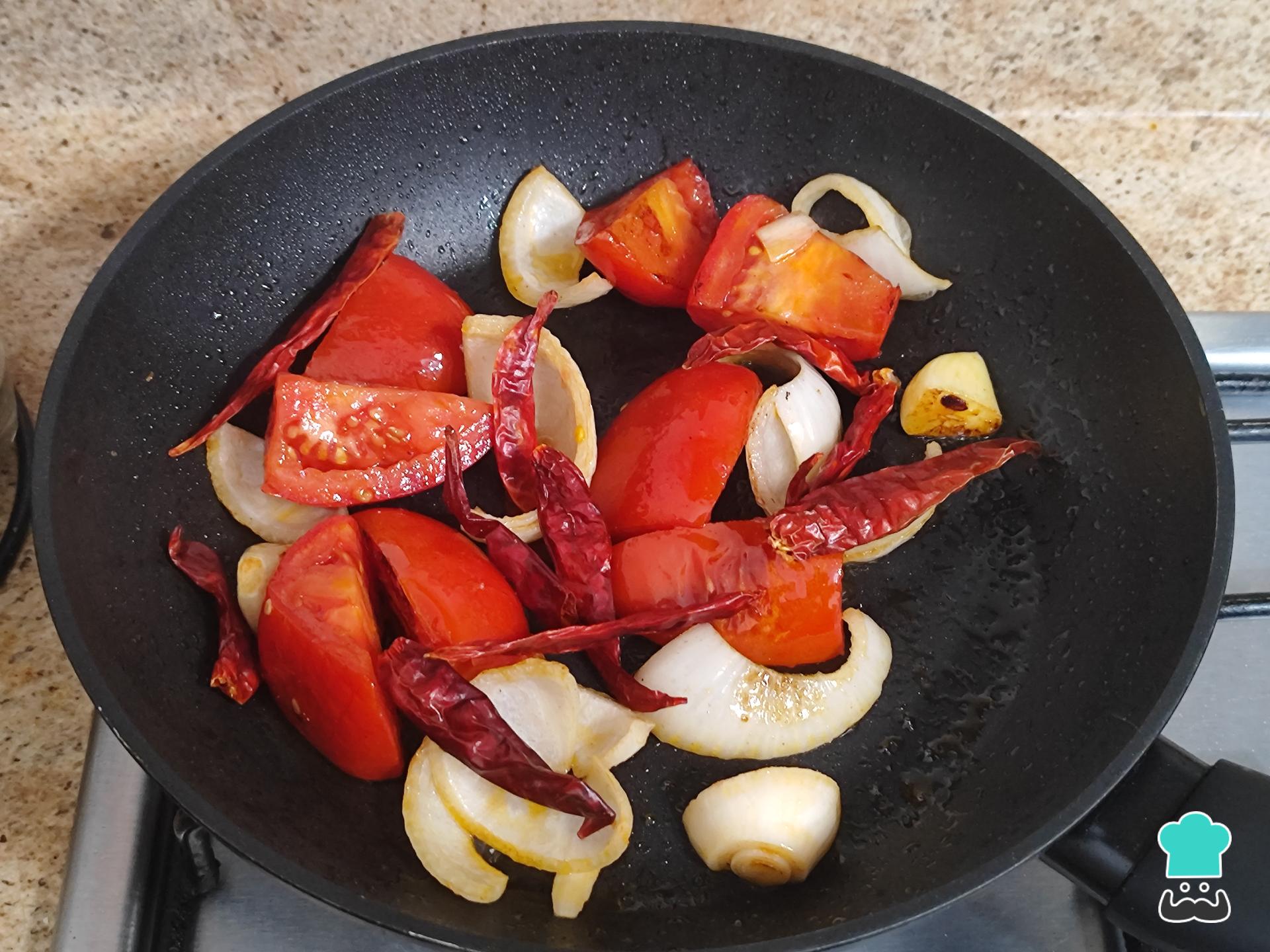 En una sartén, calienta una cucharada de aceite vegetal y sofríe la cebolla, el tomate y el diente de ajo troceados. Agrega un puñado de chiles de árbol, ajustando la cantidad según el nivel de picante que prefieras.