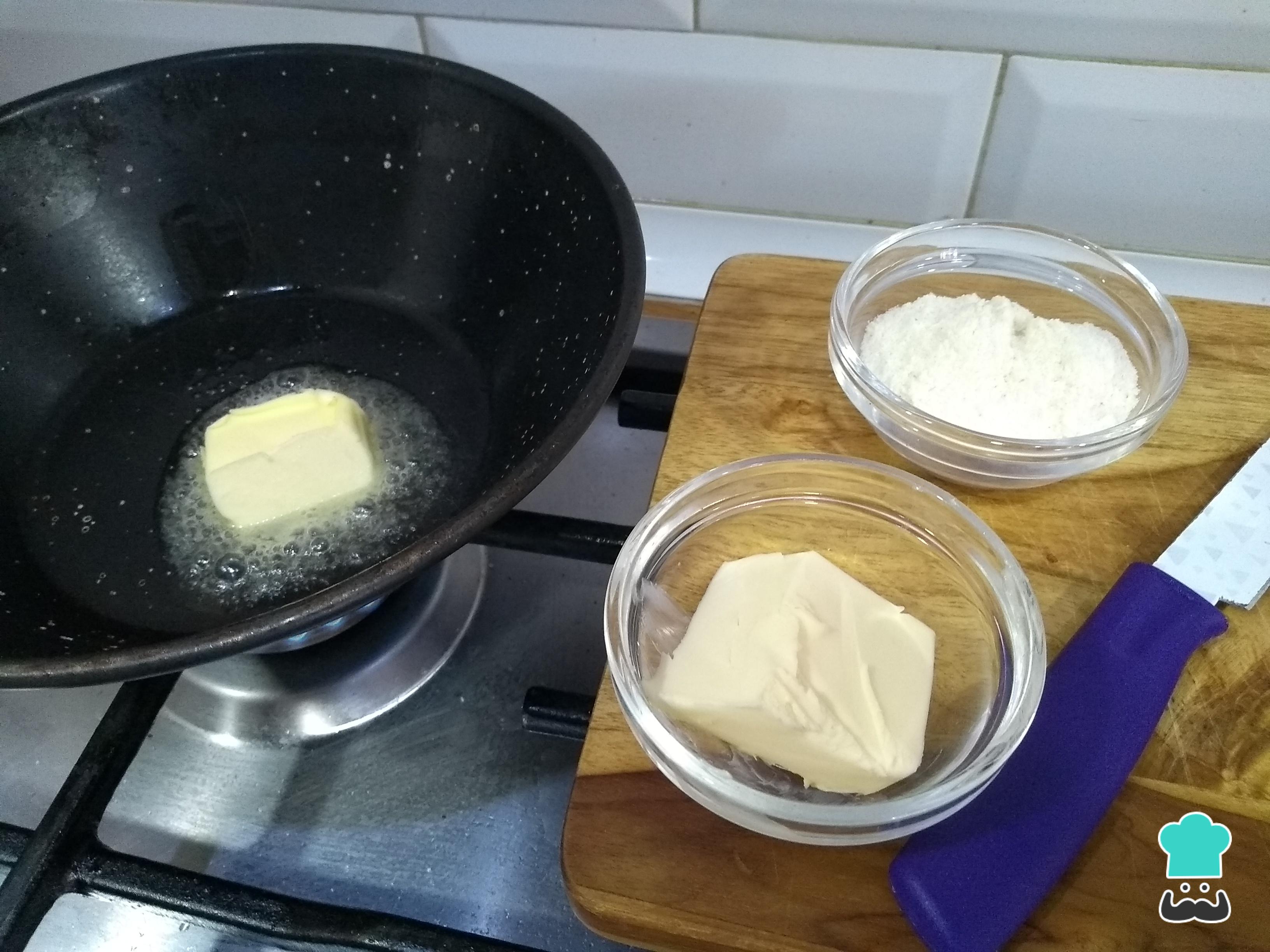 Antes de nada, queremos darte una aclaración importante sobre la salsa: la elaboraremos con un fondo de roux oscuro, es decir, una preparación de caldo y mantequilla que oscurecerá la salsa española. Siendo así, pon a calentar en la sartén un trozo de mantequilla.