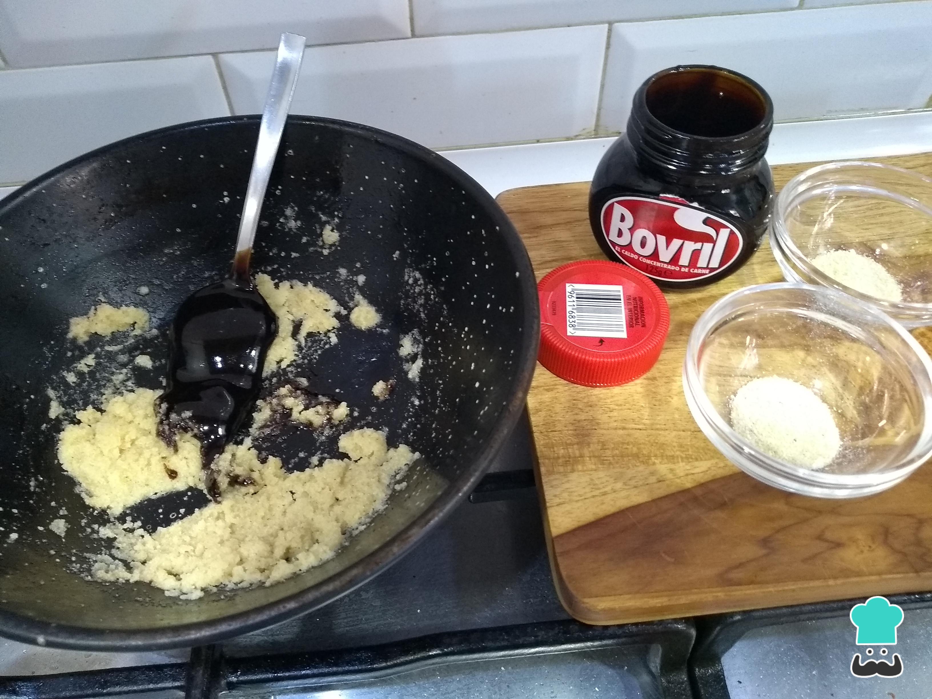 Una vez que la harina se haya dorado ligeramente, añade una buena cucharada de caldo de carne concentrado. En nuestro caso hemos usado Bovril.