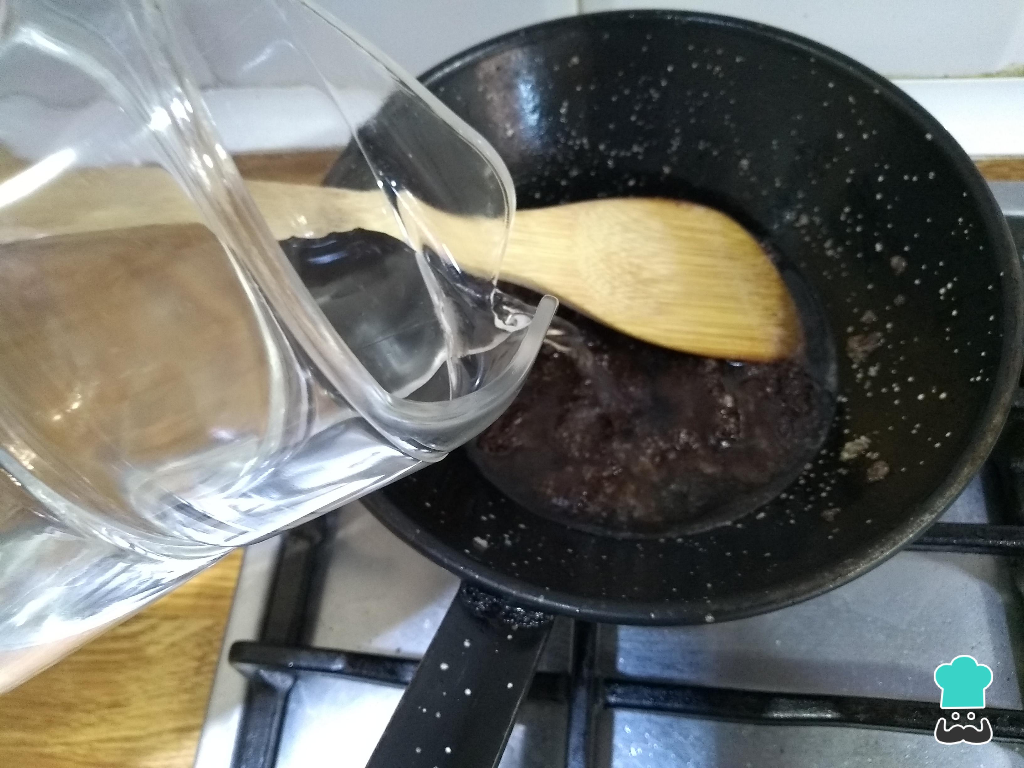Lentamente, añade un chorrito de agua sobre la mezcla para diluir el caldo y mezclar con la harina. Seguidamente, sigue añadiendo un poco más de agua y ve mezclando. Este caldo de carne tiene un punto fuerte de sal, pero prueba de sal y, si lo precisa, dale un punto más.