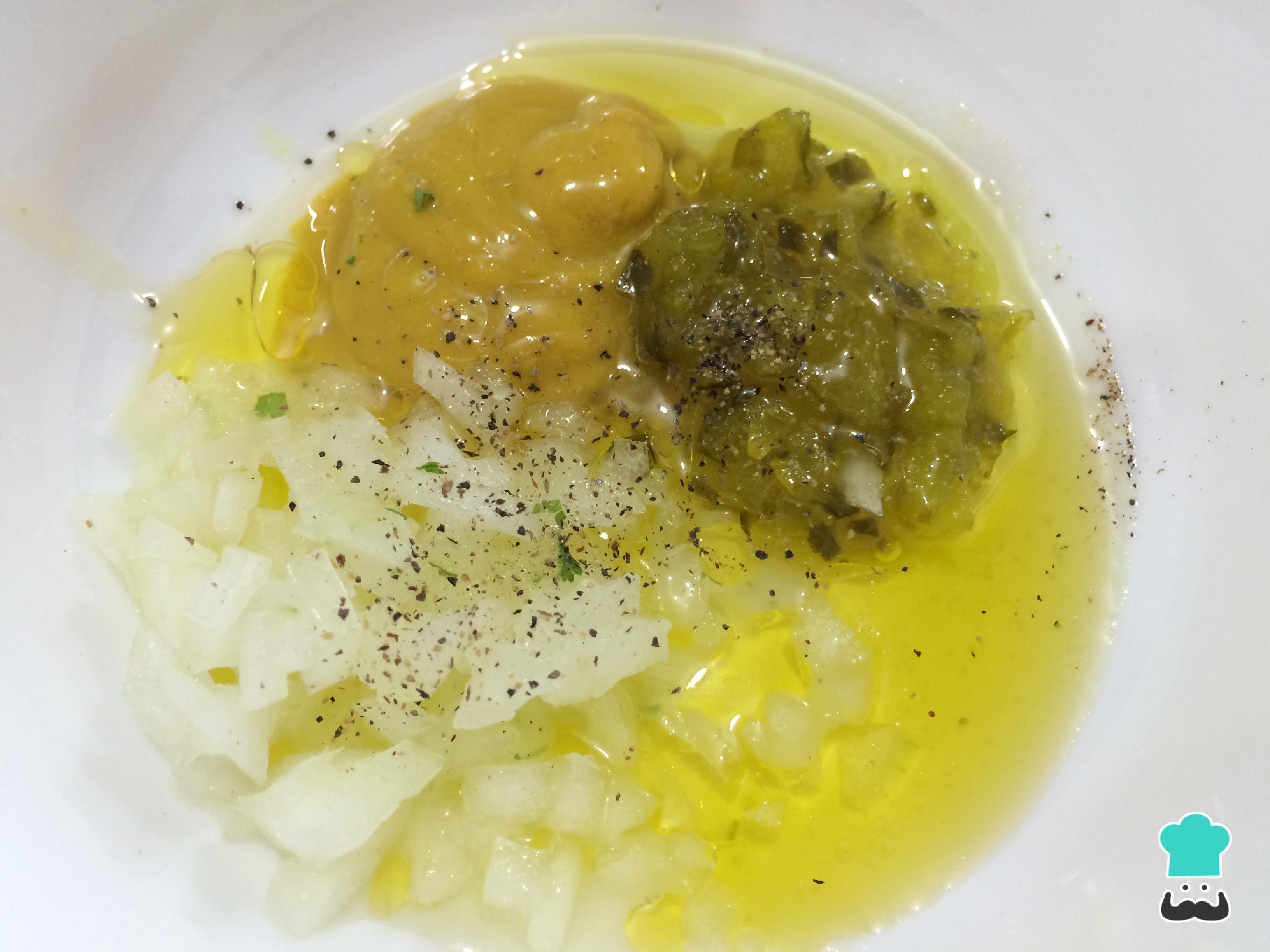 Aparte, en un bol mezclar el aceite de oliva con la mostaza, los pepinillos y la cebolla finamente picados.