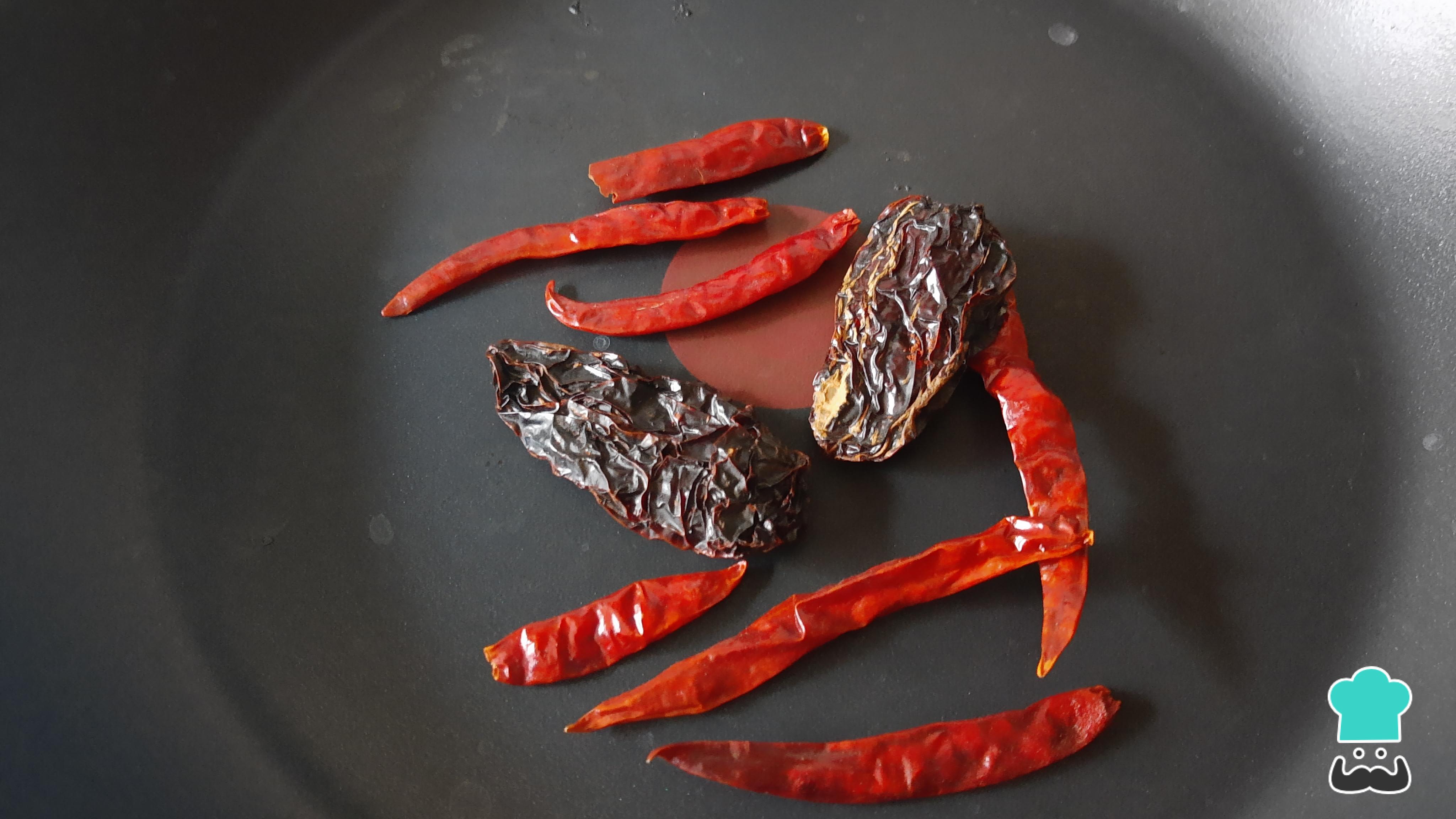Pon a tatemar los chiles secos, mantén una temperatura muy baja y proporciona la vuelta cuando notes que se inflan un poco.