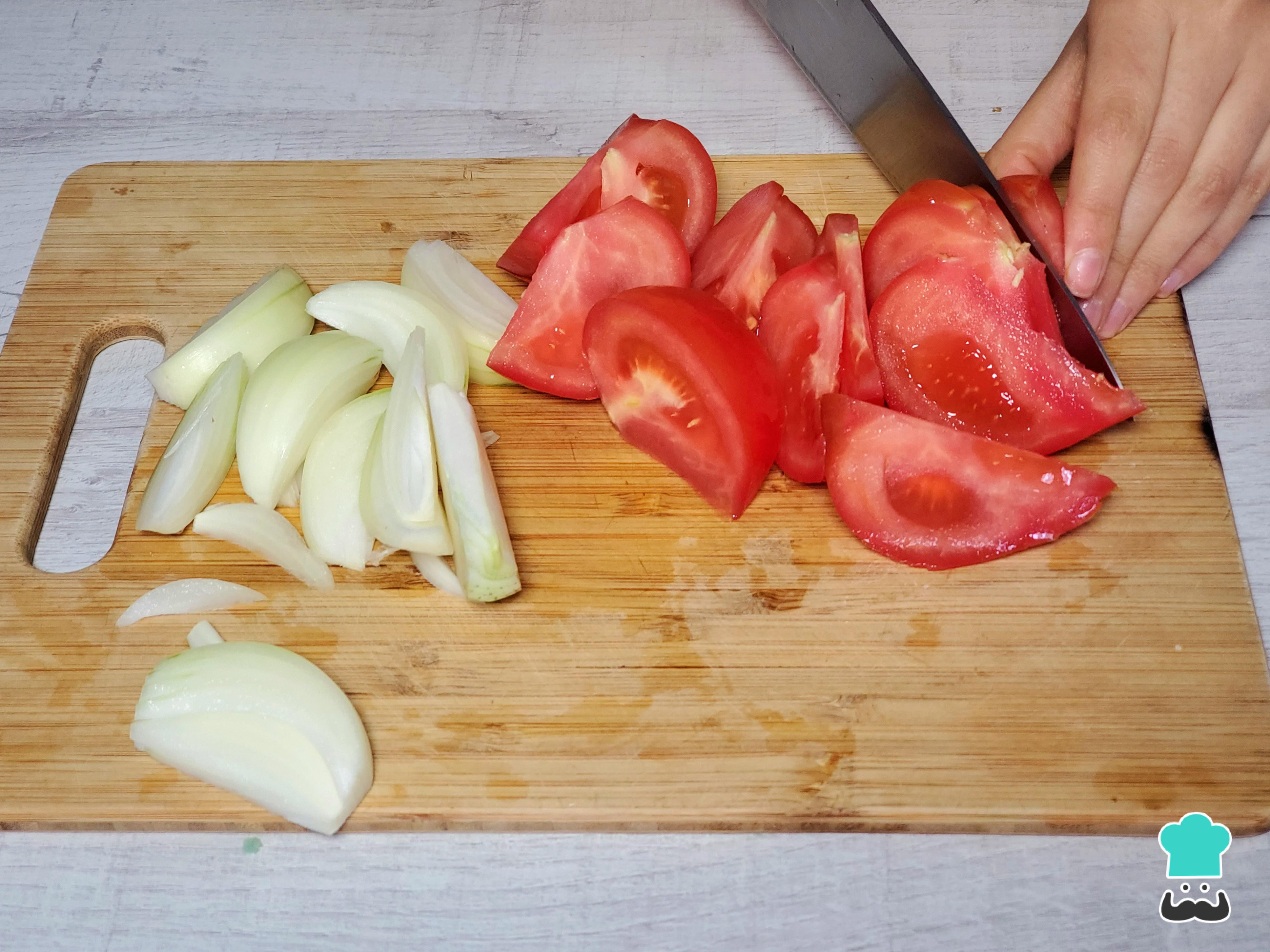 Empieza preparando los vegetales: corta la cebolla y los tomates en gajos, como si fueras a hacer lomito de atún saltado. Además, pica finamente el culantro, el kion (jengibre) y el ajo.