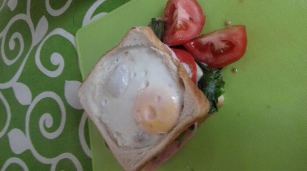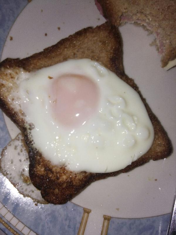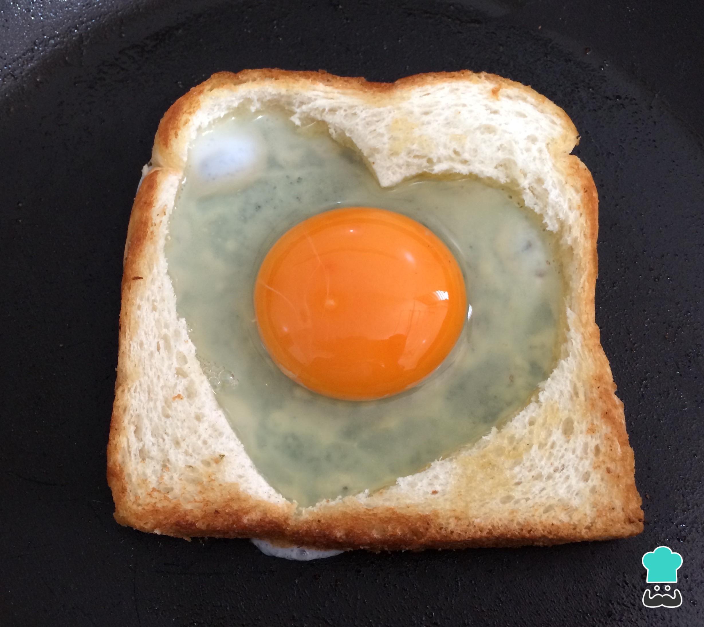 Aparte con el cortador en forma de corazón, cortar el pan y tostar en el sartén con mantequilla. Después, y con mucho cuidado, añadir el huevo y cocinarlo hasta que esté en el punto deseado, añadir una pizca de sal.