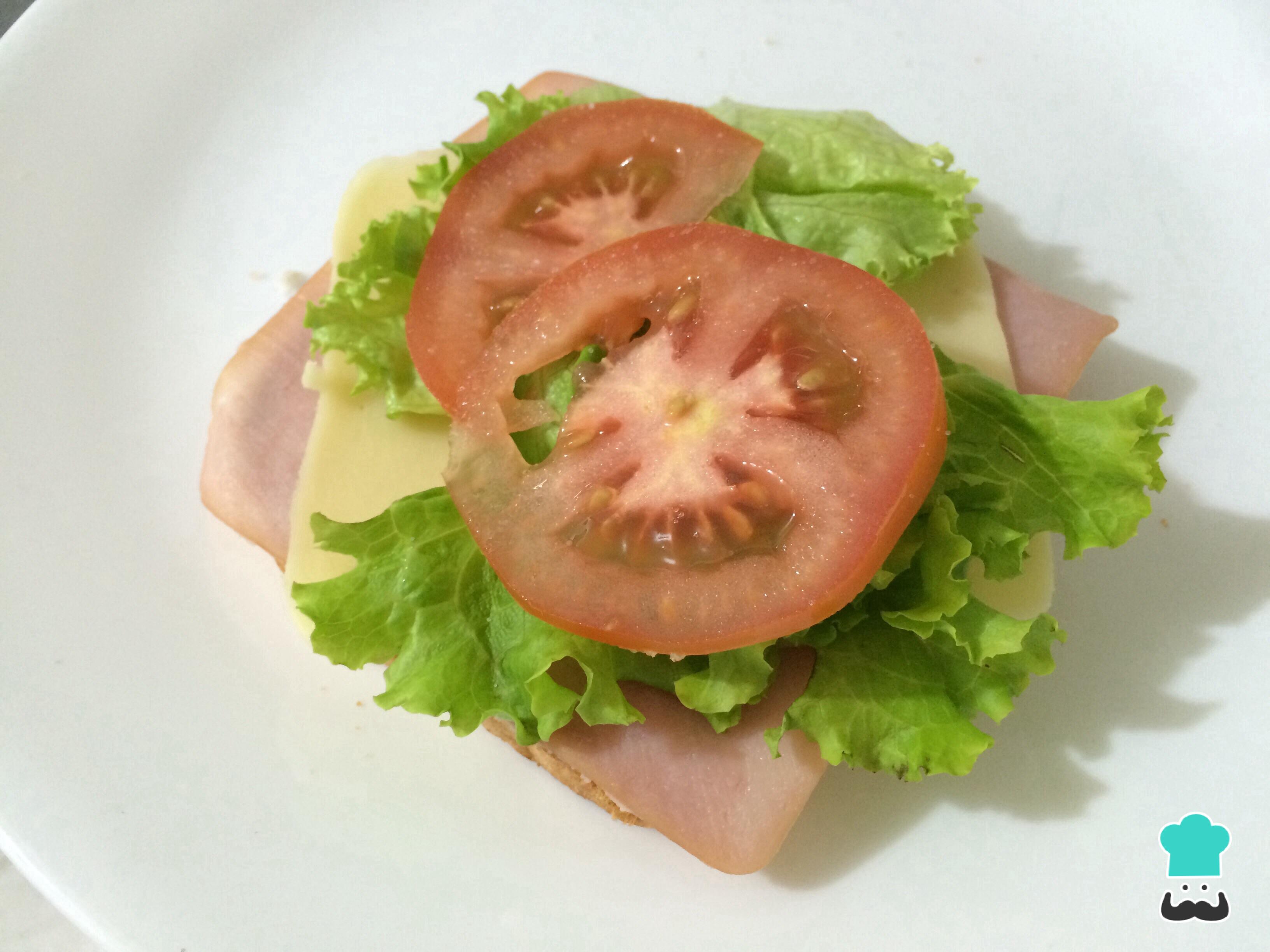 Por otro lado armar el sándwich americano. Para ello, en una rodaja de pan tostado, añadir mayonesa, una rodaja de queso, jamón, lechuga y tomate, añadir también una pizca de sal y pimienta al gusto.
