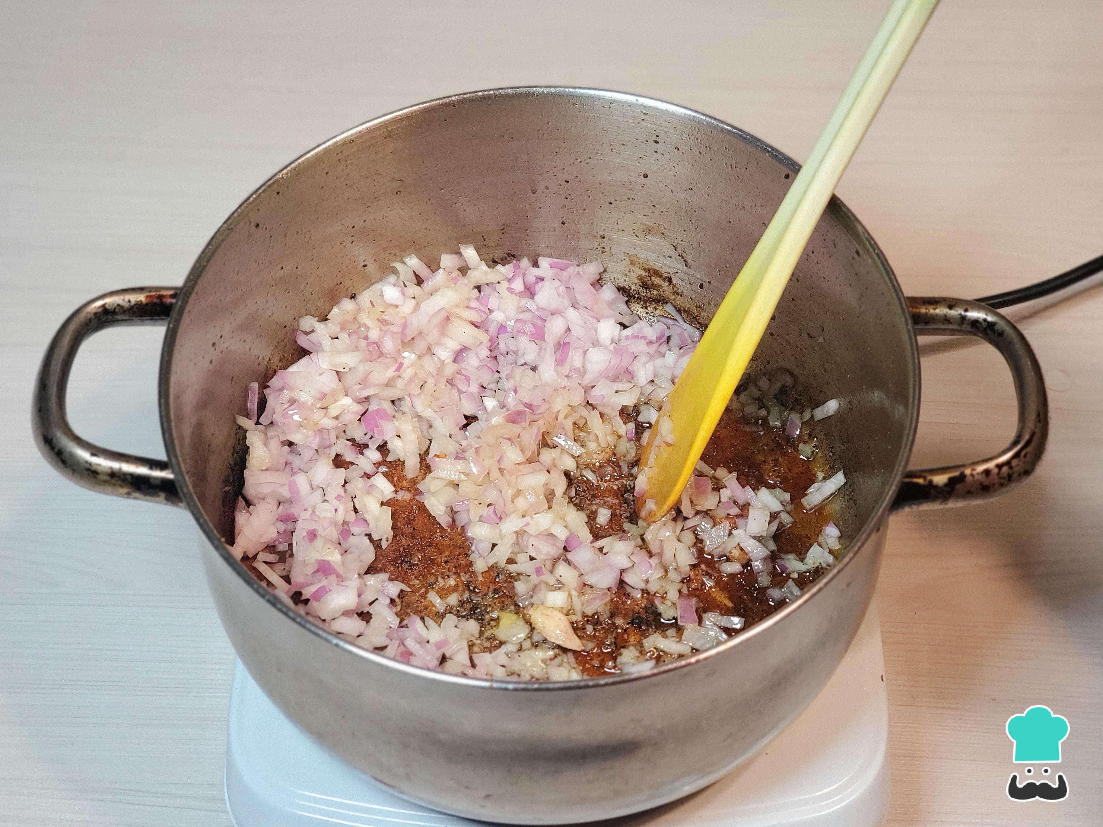 En la misma olla, añade un chorro de aceite si hace falta y coloca las cebollas finamente picadas para hacer el aderezo. Remueve con un cucharón y, si notas que está tomando mucho color y se va a quemar, agrega un buen chorro de agua para despegar los restos caramelizados del pollo.