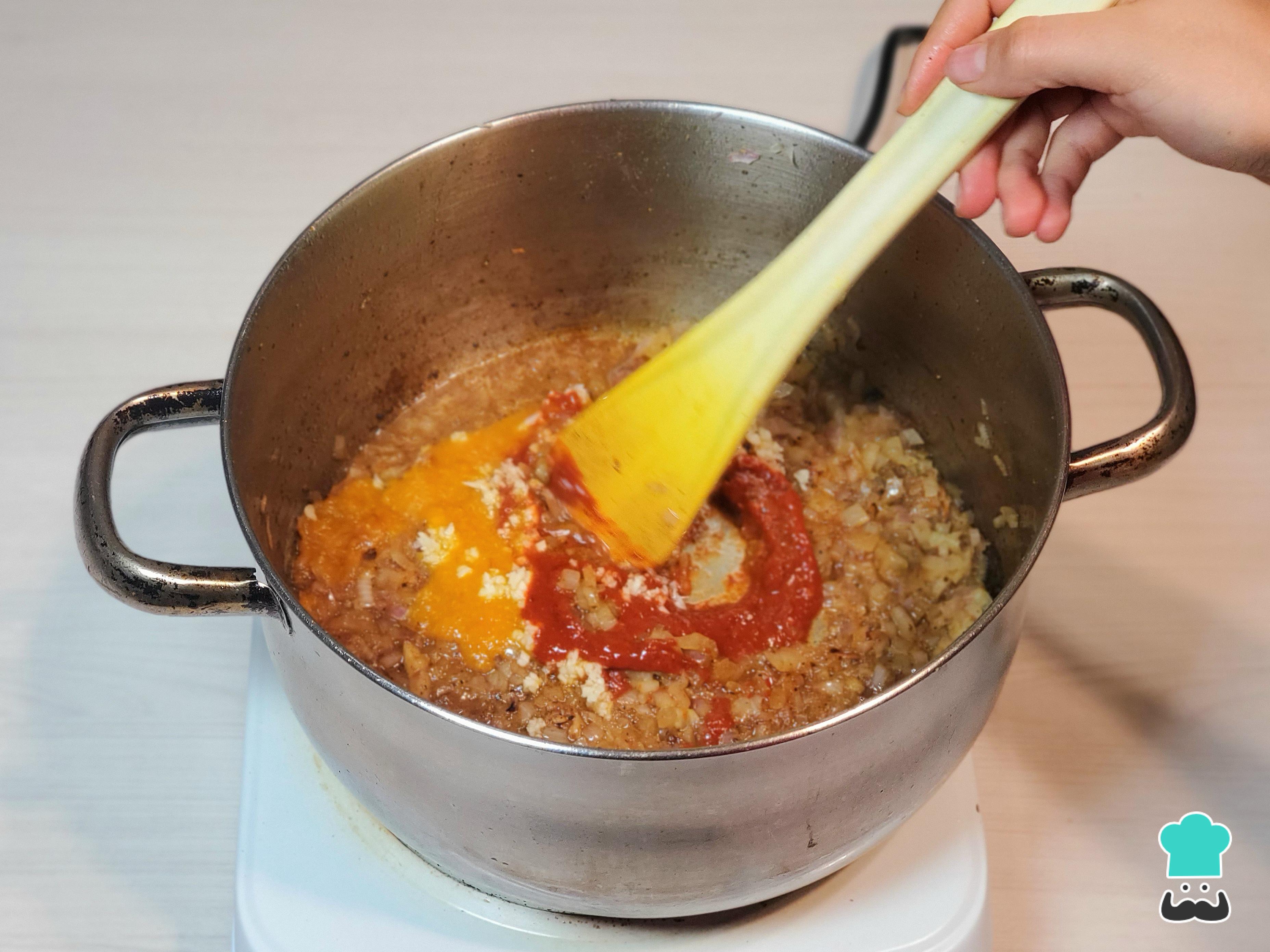 Después de unos 10 minutos, cuando la cebolla ya esté traslúcida, incorpora el ají panca, el ají amarillo o mirasol y el ajo molido. Remueve continuamente durante unos 15 minutos a fuego bajo hasta que el aderezo tenga una consistencia similar a una mermelada.