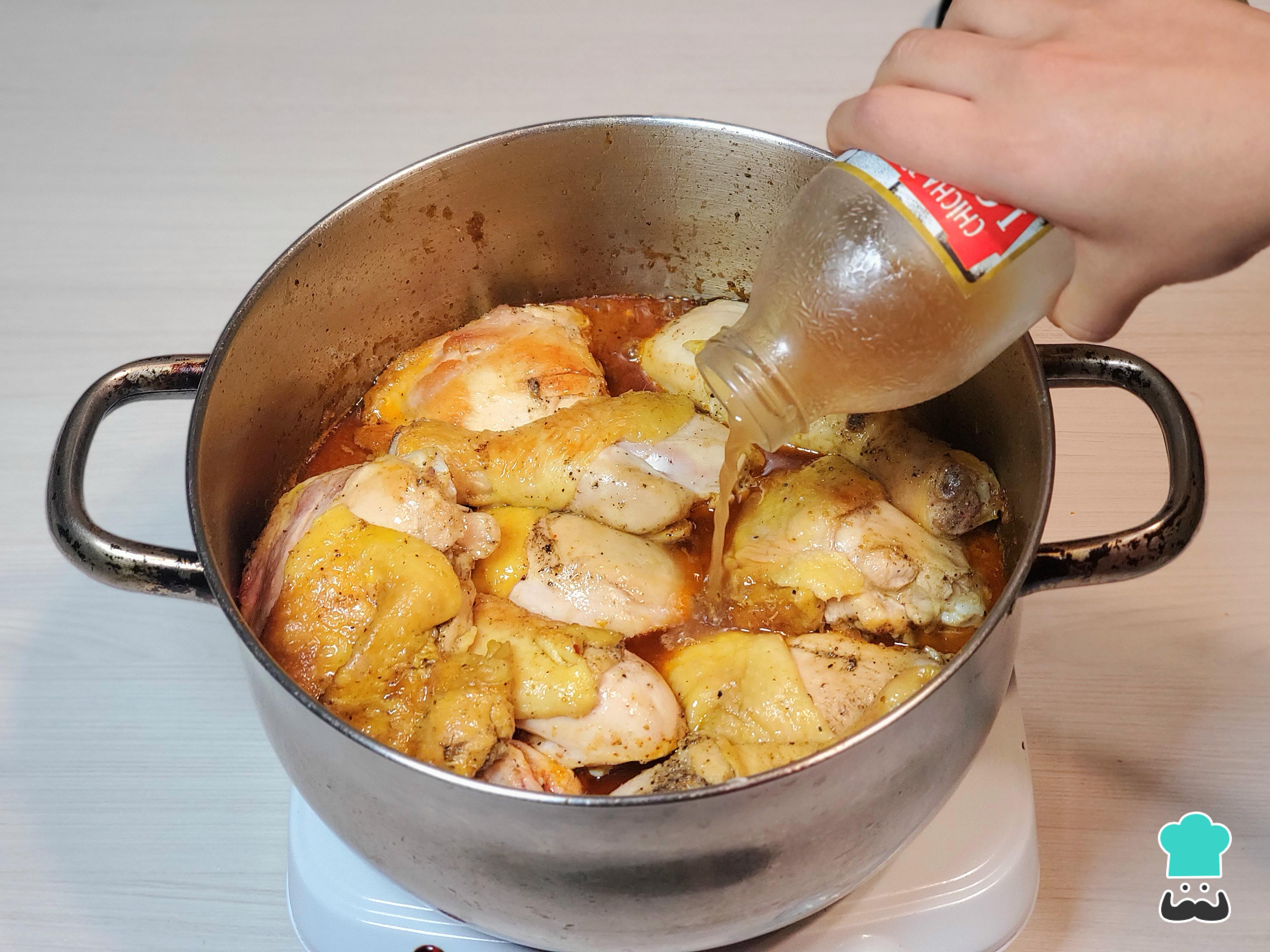 Reincorpora las piezas de pollo y vierte la chicha de jora, la cerveza negra y el caldo de pollo hasta cubrir.