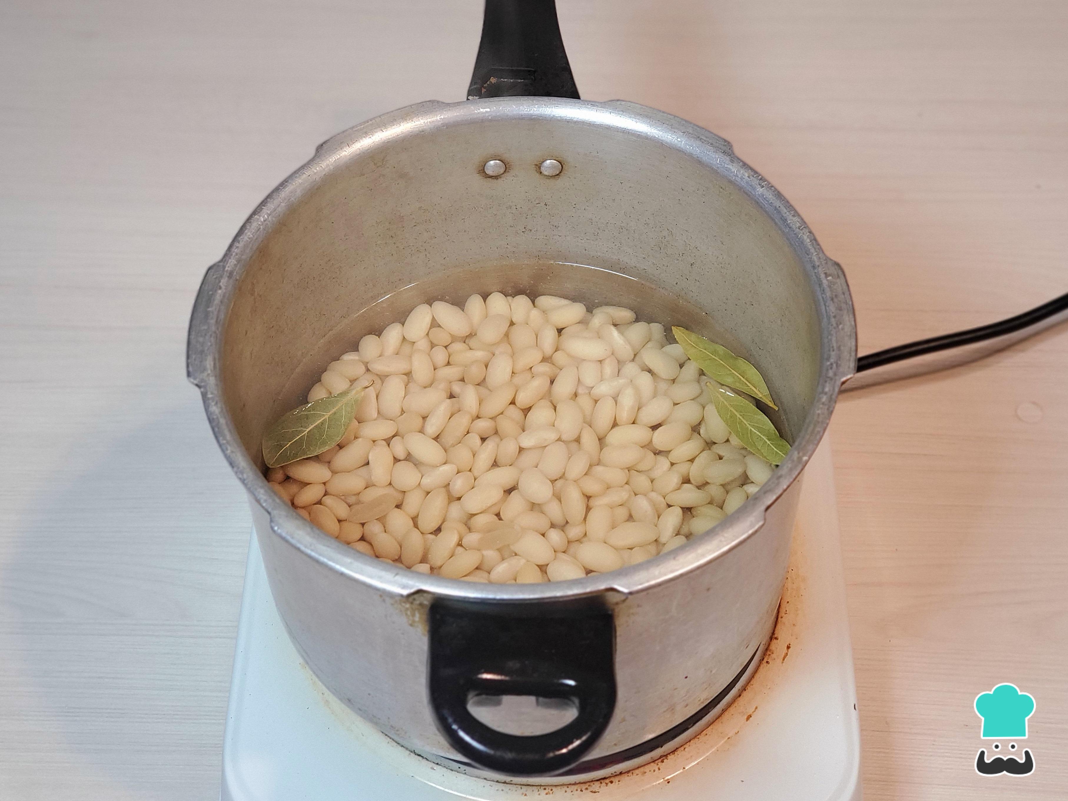 Al día siguiente, cuando vayas a empezar con la cocción, lávalos bien y colócalos en una olla, de preferencia a presión, con agua fría hasta cubrir, unas hojas de laurel y una lonja de tocino.