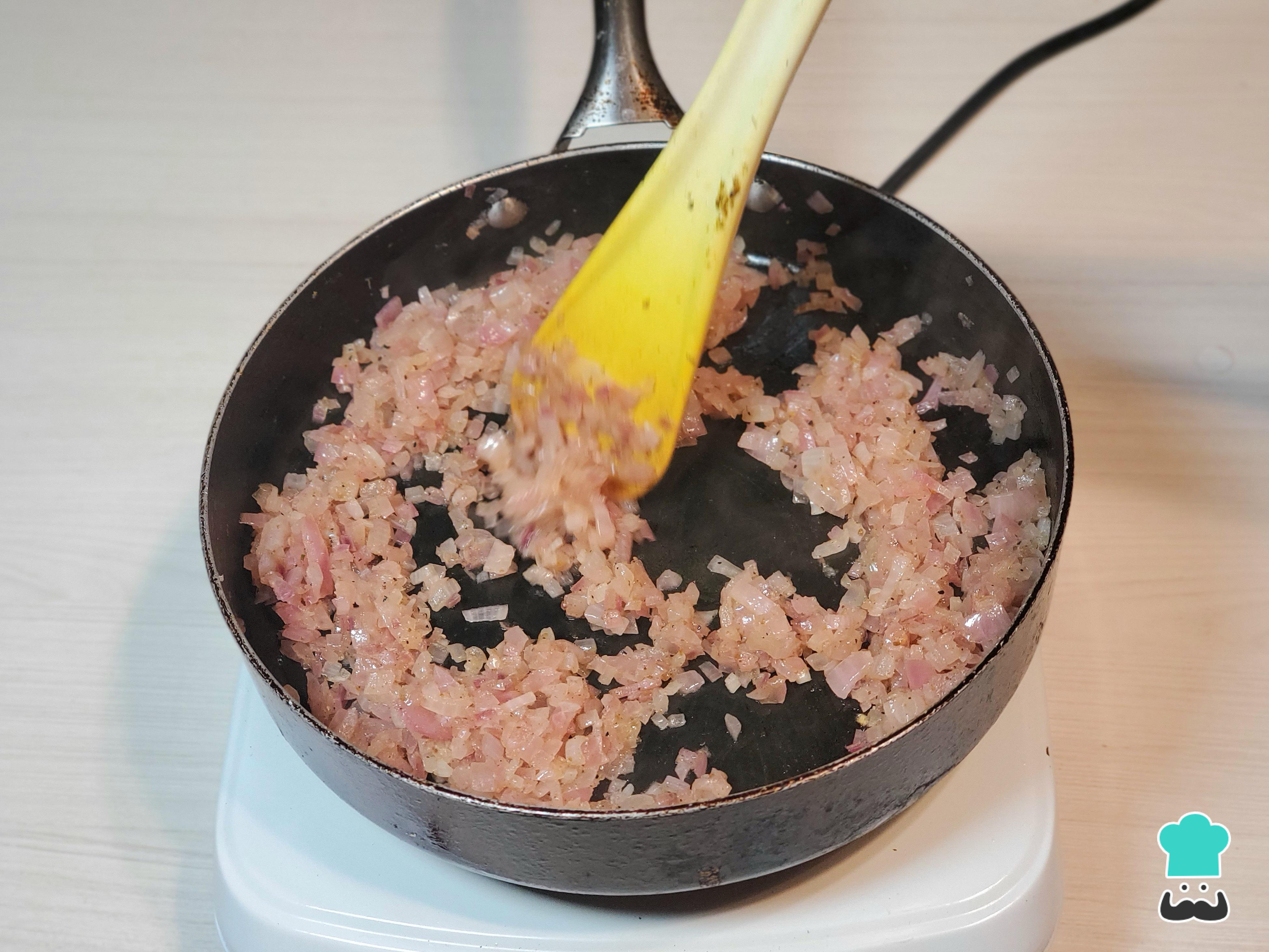 Aparte, prepara un aderezo con cebolla finamente picada, ajo molido, pimienta, comino y sal. Sofríe estos ingredientes por un par de minutos en una sartén con un buen chorro de aceite y, cuando la cebolla esté traslúcida, agrega el aderezo a la olla con los frejoles. Remueve bien y rectifica la sazón.