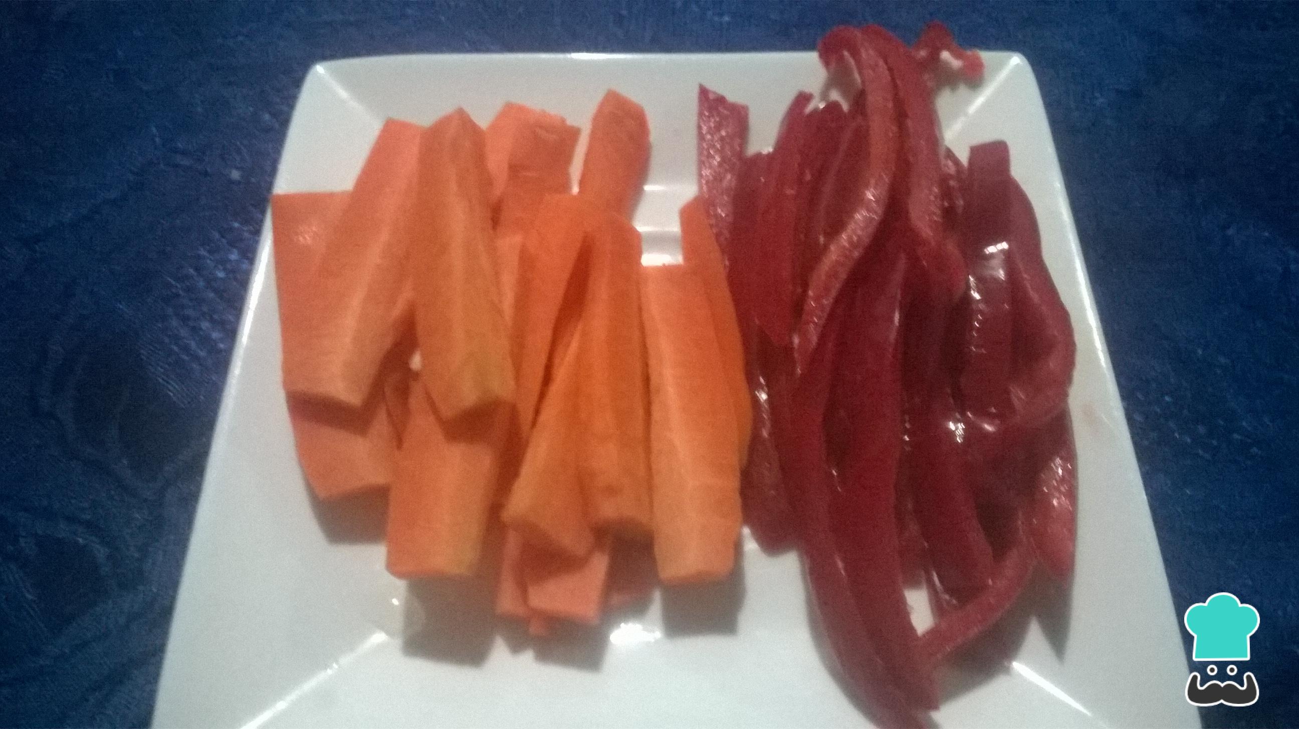 Corta en bastones la zanahoria y el pimentón o pimiento rojo para empezar a preparar el relleno de la carne.