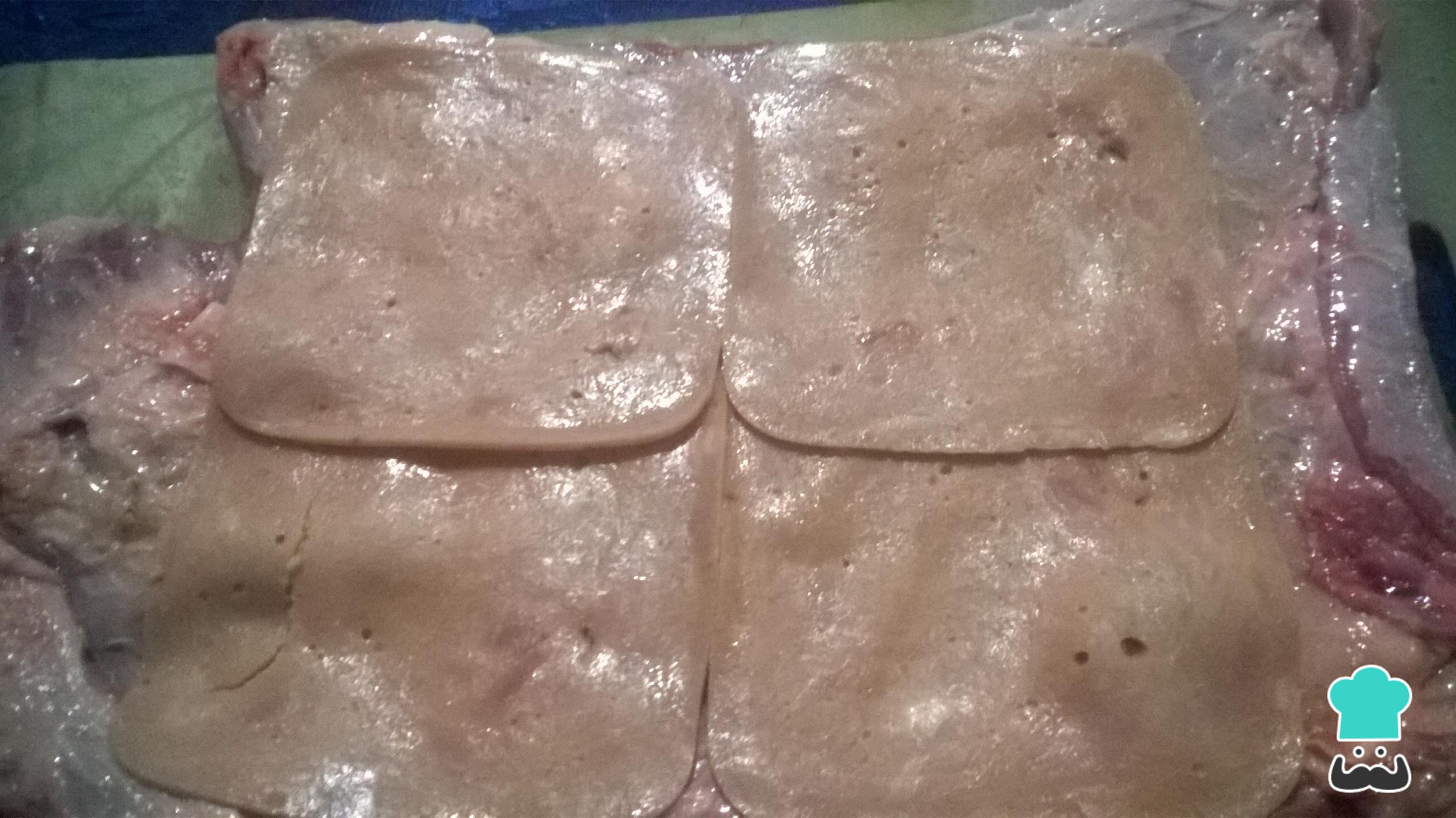 Coloca el jamón sobre la carne extendida tal y como se muestra en la fotografía.