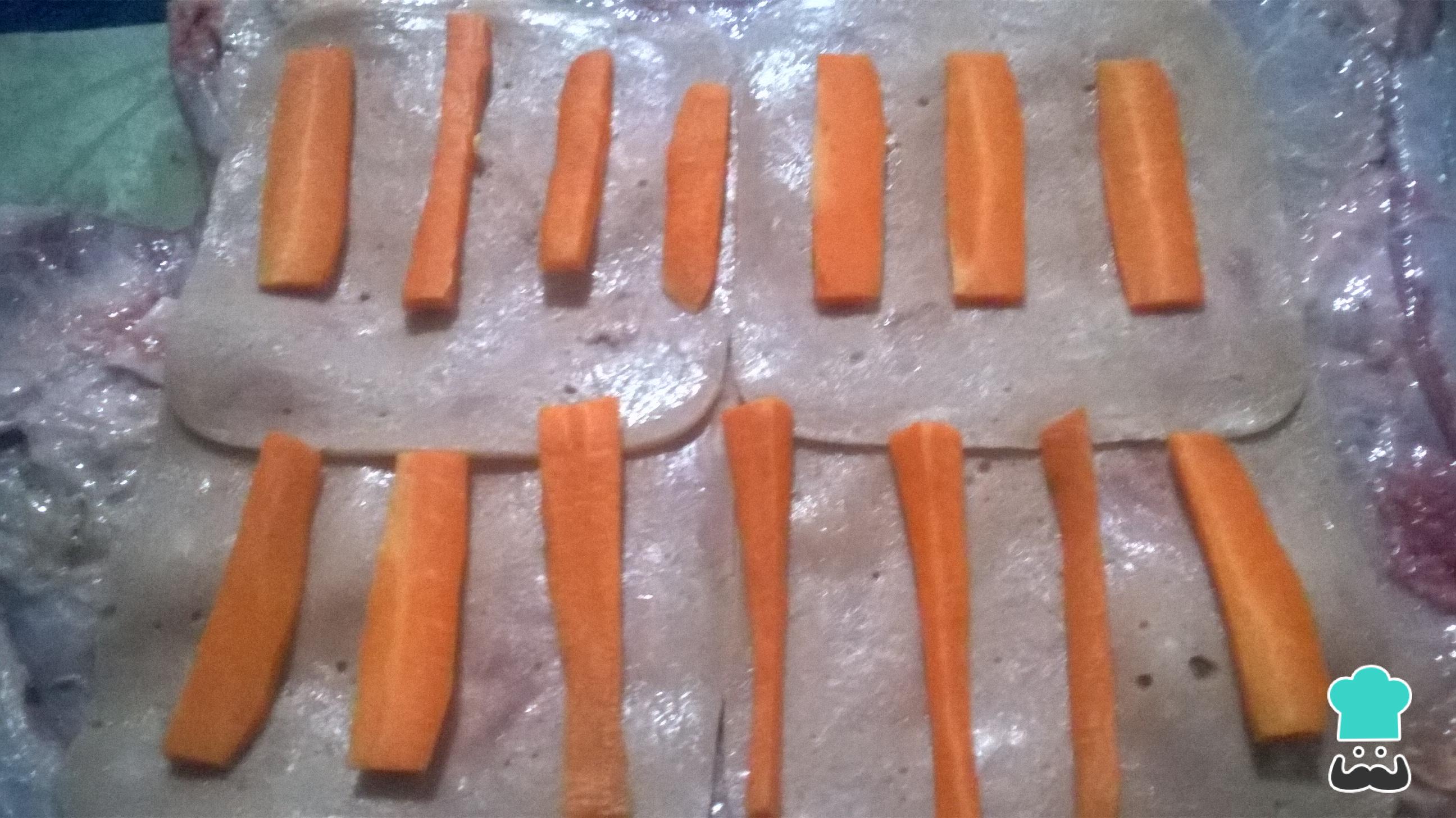 Coloca los bastones de zanahoria separados para que cuando se enrolle la sobrebarriga queden bien distribuidos.