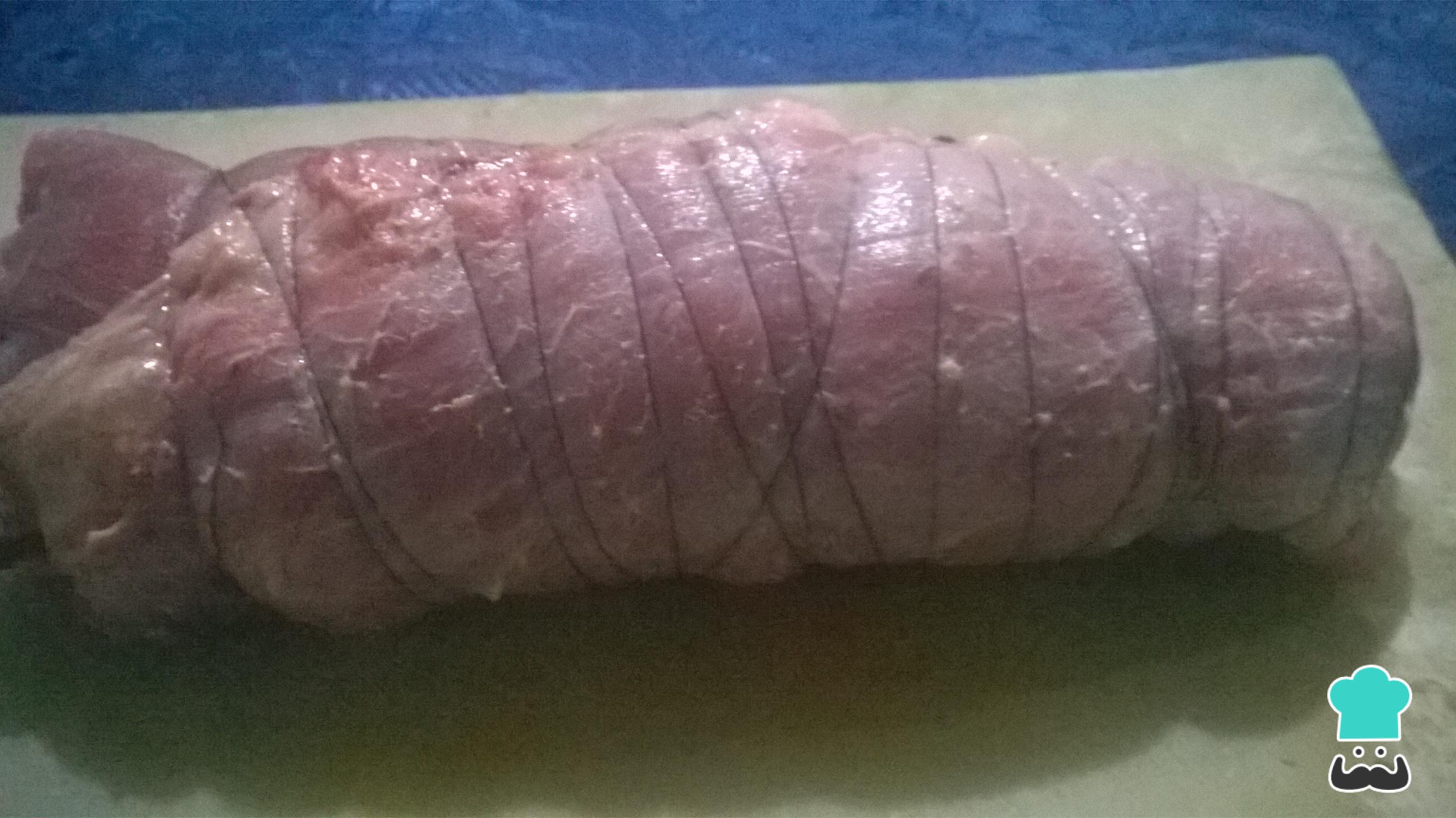 Enrolla la sobrebarriga rellena bien para que no se salga los ingredientes y, con el hilo de cocina, amárrala bien.