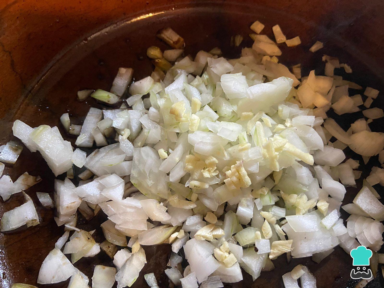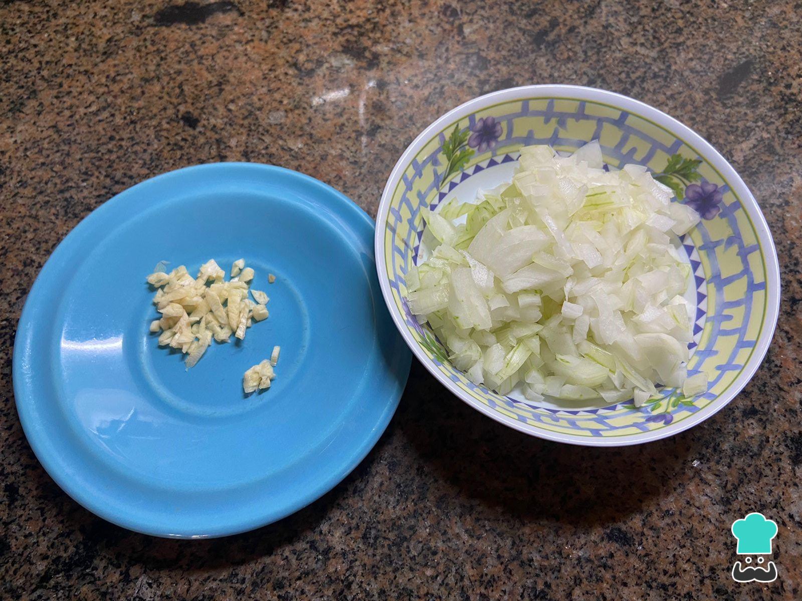 En primer lugar, pela y pica la cebolla y el diente de ajo. Reserva.