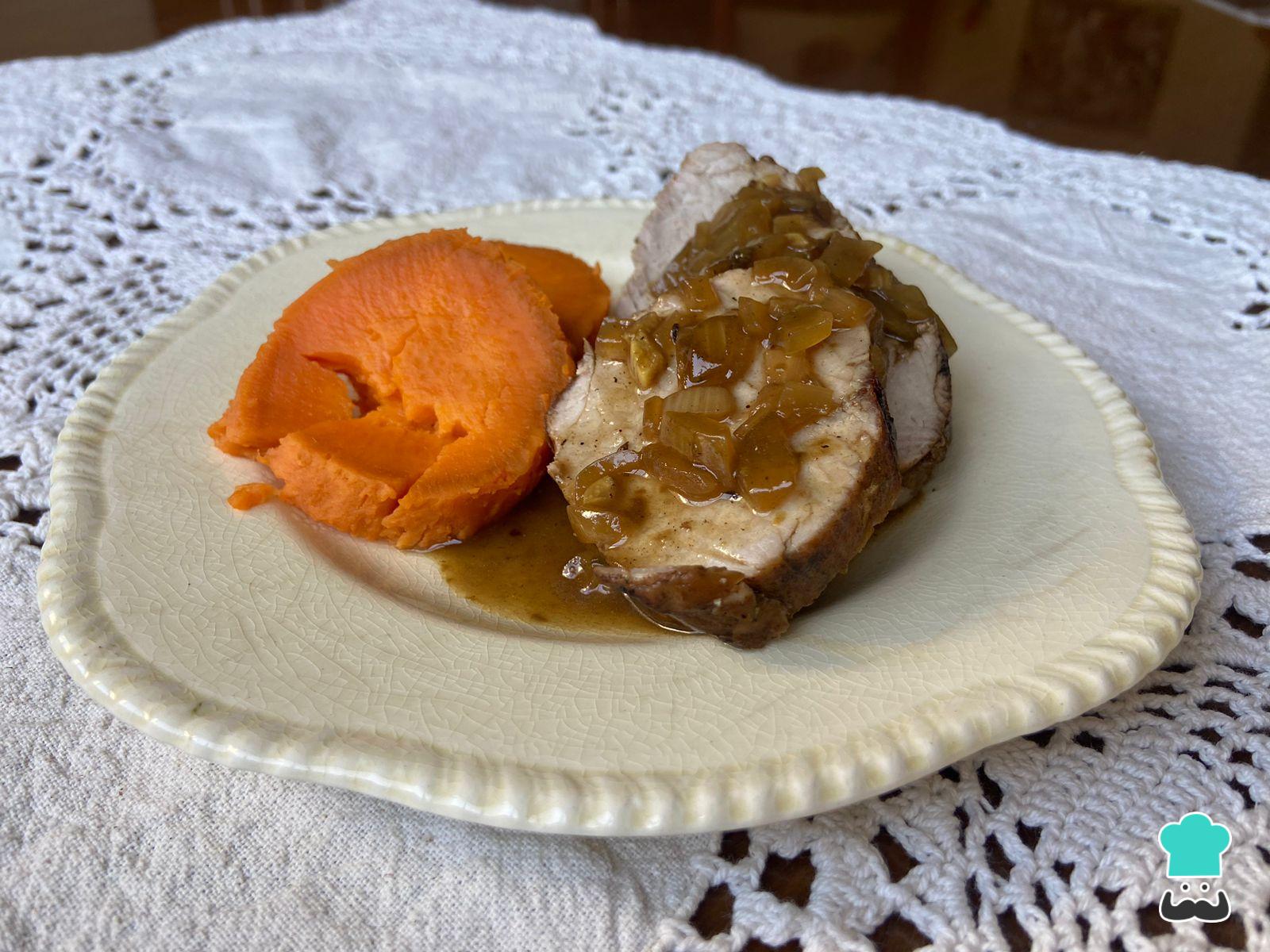 Para no competir con el sabor de la preparación, recomendamos acompañar con productos más neutros o bien aquellos que resalten los del solomillo. Por ejemplo, boniato al microondas o dulce de batata sin azúcar es un acompañamiento ideal para esta receta. En este caso, acompañamos con una batata hervida, pero también puedes usarla asada o en puré. Sin embargo, como la receta ya es algo dulce, puedes usar papa, la cual también puede ser hervida, asada o en puré. Otras combinaciones que quedarán deliciosas son: panaché de verduras o arroz blanco salseado con el jugo de la preparación.