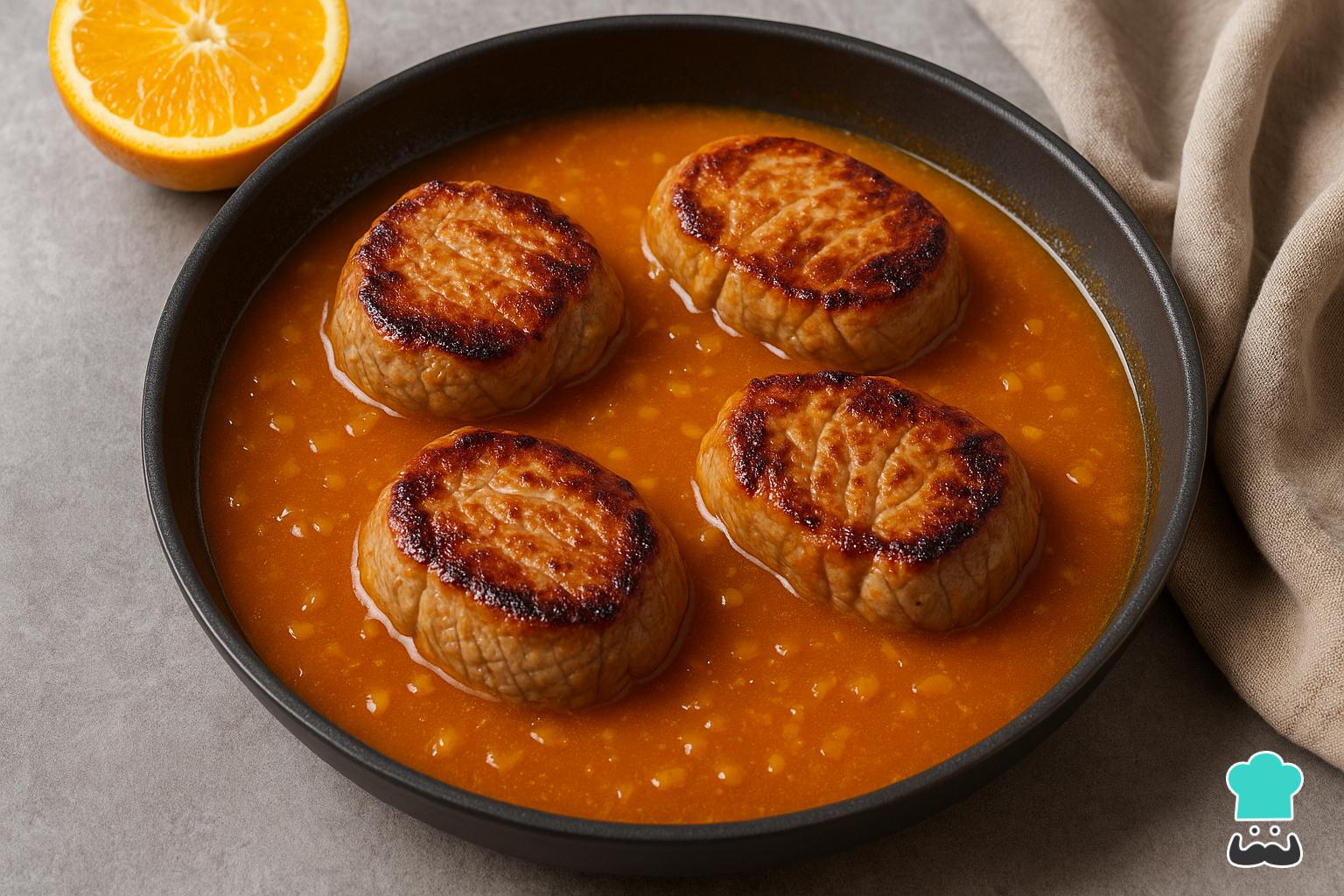 Sella previamente los solomillos vuelta y vuelta en una sartén con aceite bien caliente para conservar sus jugos y dar un sabor más profundo al plato. Después, incorpóralos dentro de la salsa y deja que se cocine todo junto a fuego medio-bajo entre 12 y 18 minutos, dándoles la vuelta a mitad de tiempo para garantizar una cocción uniforme. El objetivo es que la carne quede muy jugosa por dentro y bien impregnada con la salsa de naranja por fuera.