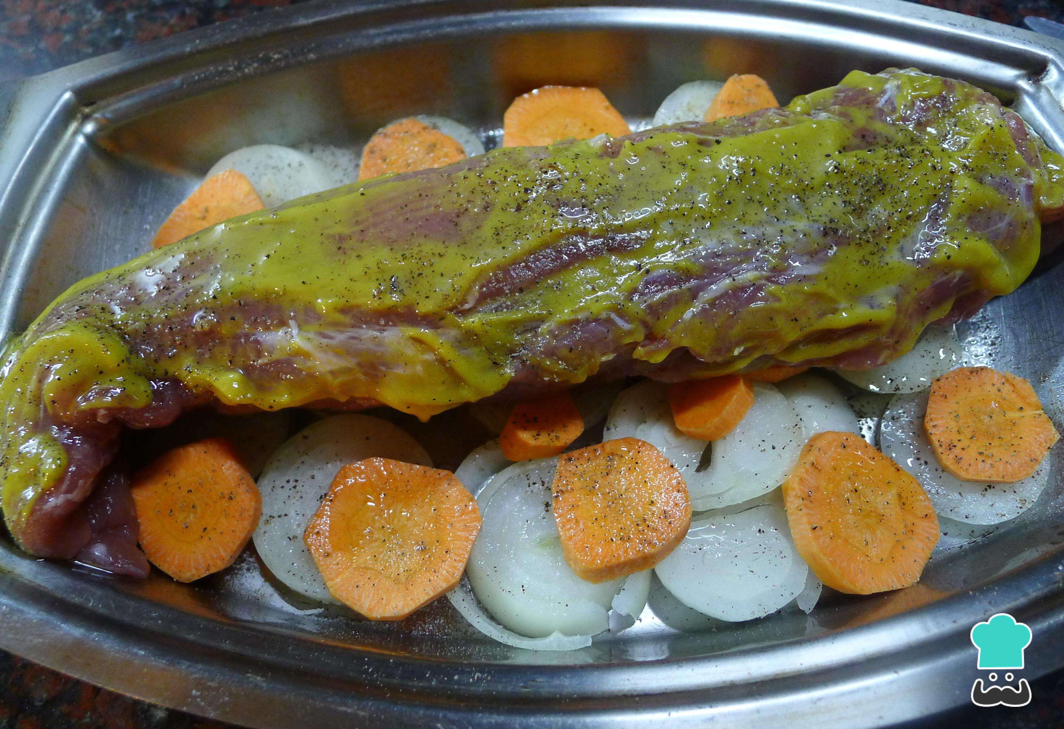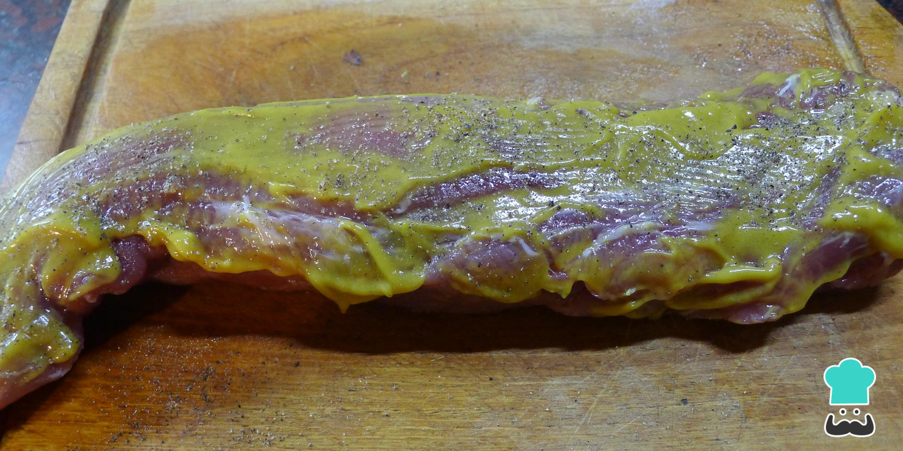 Condimentar el solomillo con sal y pimienta y, luego, untarlo con abundante mostaza.