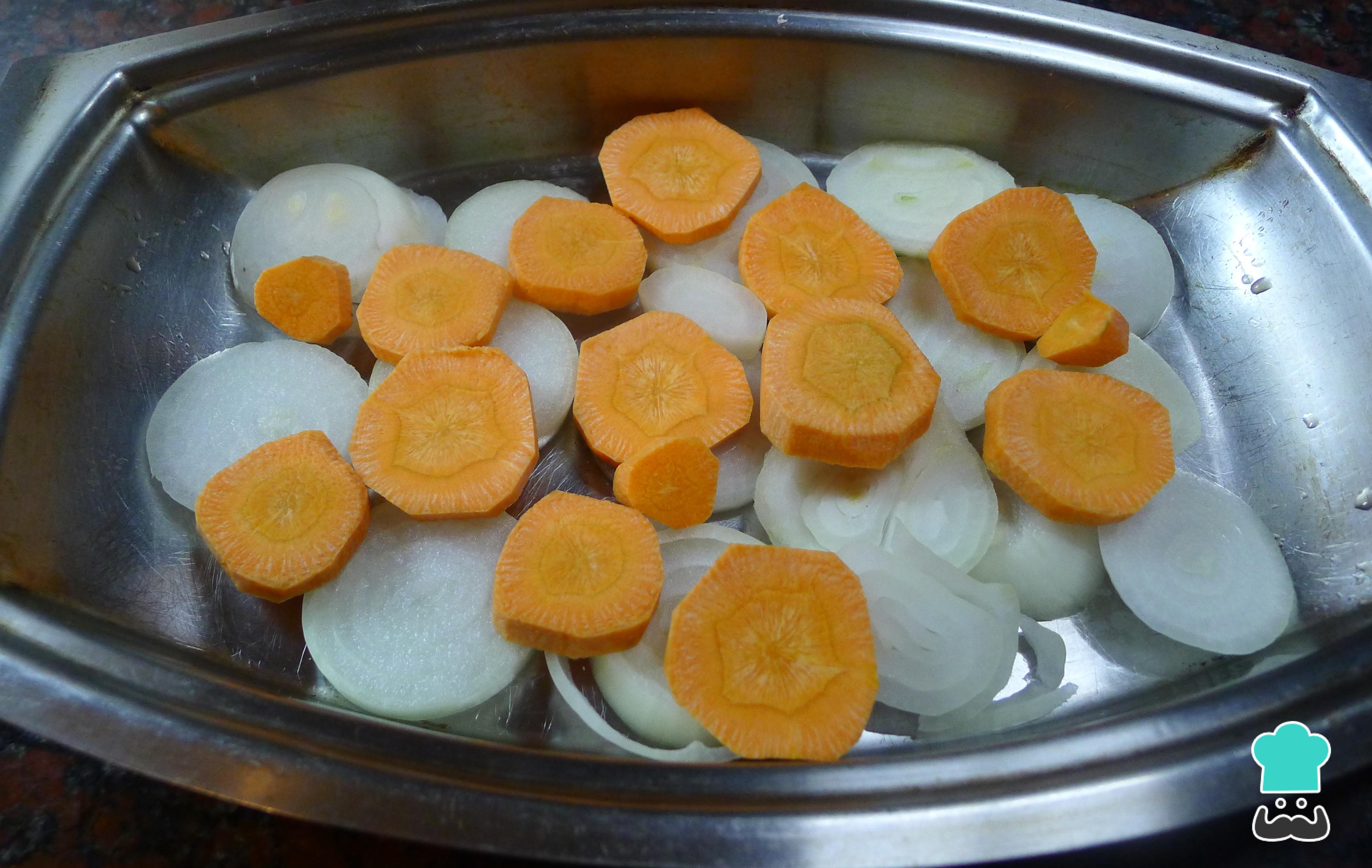 Aparte, en una placa para horno, armar una base de cebollas y zanahorias cortadas en rodajas. Salpimentar.