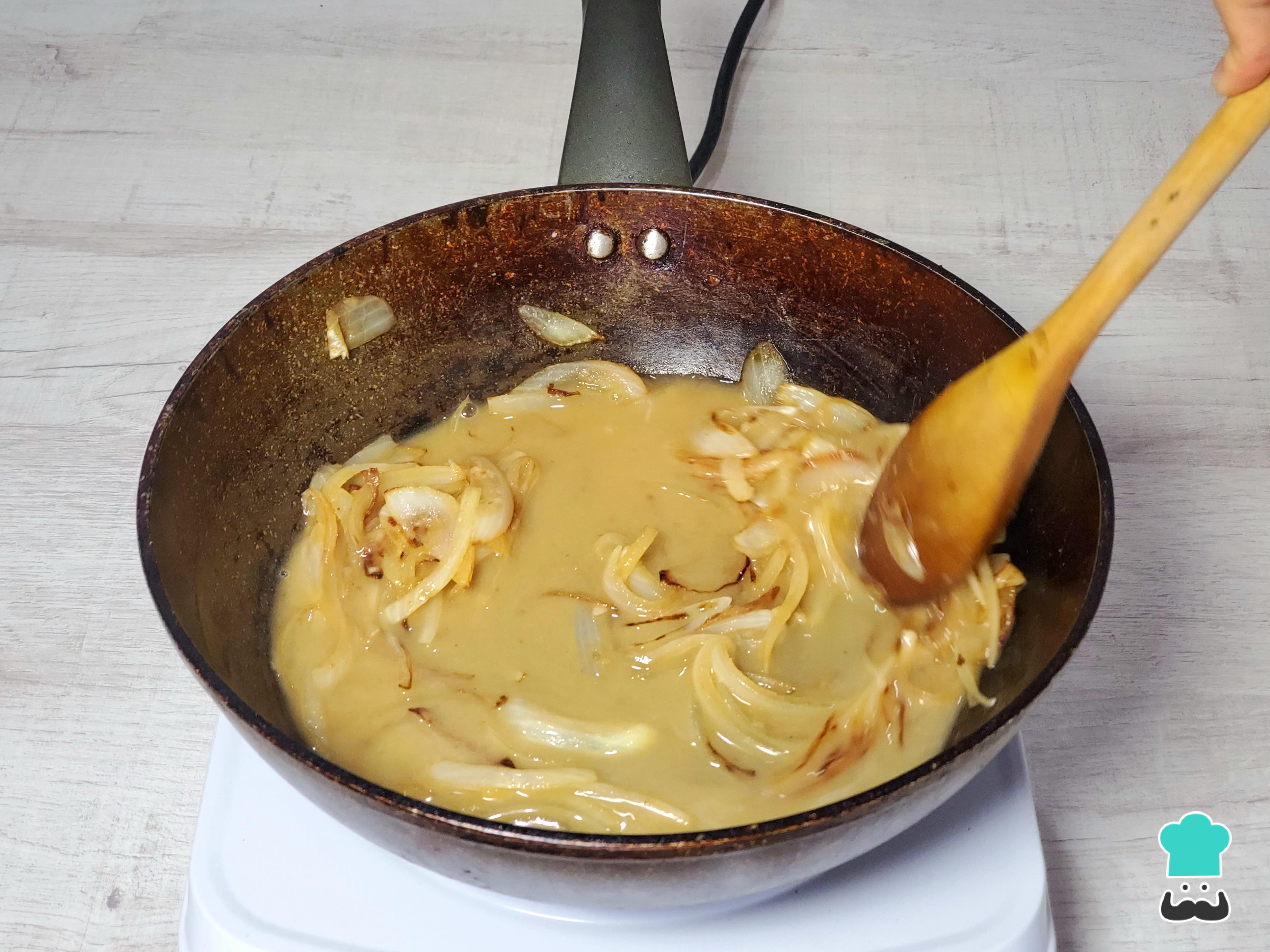 Sofríe la cebolla en pluma en la misma sartén donde sellaste la carne. Muévelas durante un par de minutos hasta que se vean doradas, luego vierte el vino, remueve bien y deja que se evapore.