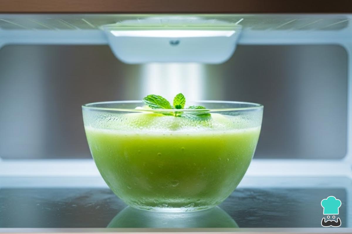 Refrigera la sopa fría de melón durante al menos 2 horas antes de servir para que los sabores se integren completamente. La temperatura fría es esencial para esta receta sopa de melón.