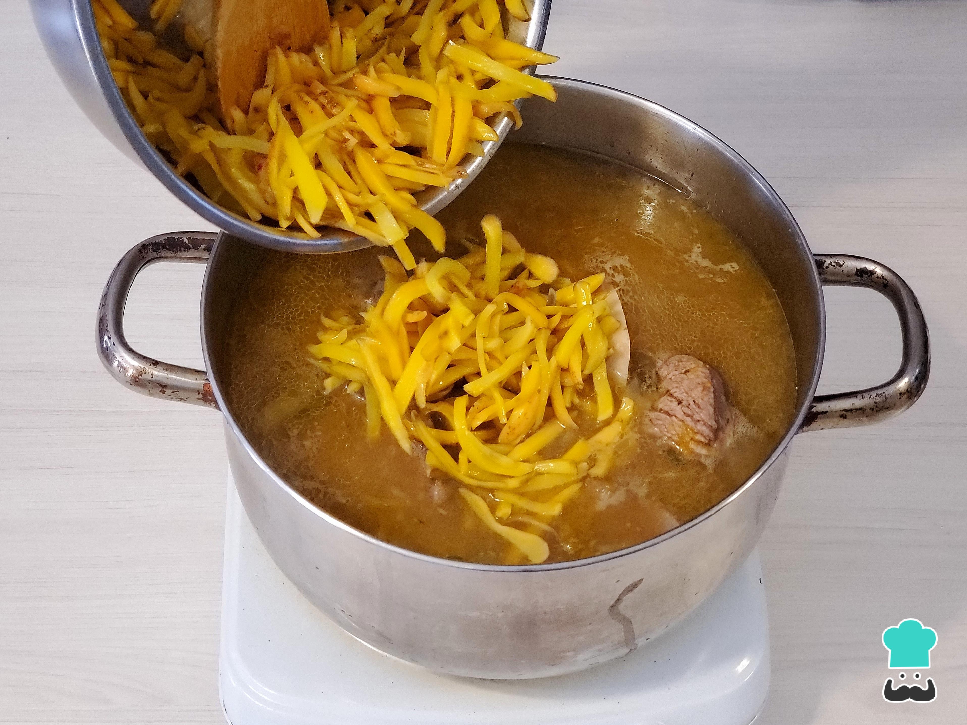Cuando la carne esté suave, añade la papa y una cucharadita de sal. Déjala cocinar por 5 minutos.