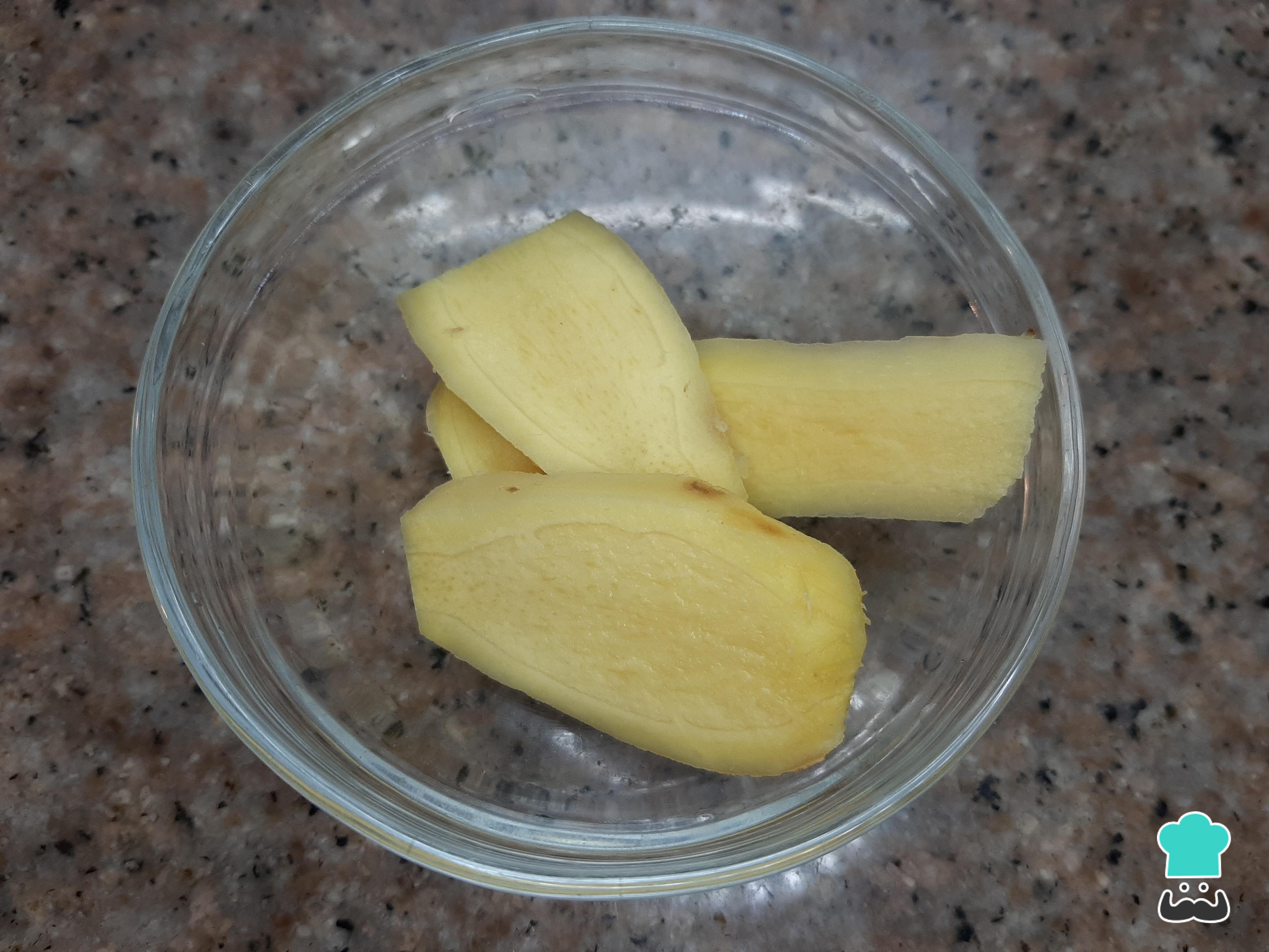 Para empezar con la receta de sopa fuchifú, primero debes pelar el jengibre y cortarlo en láminas. Resérvalo.