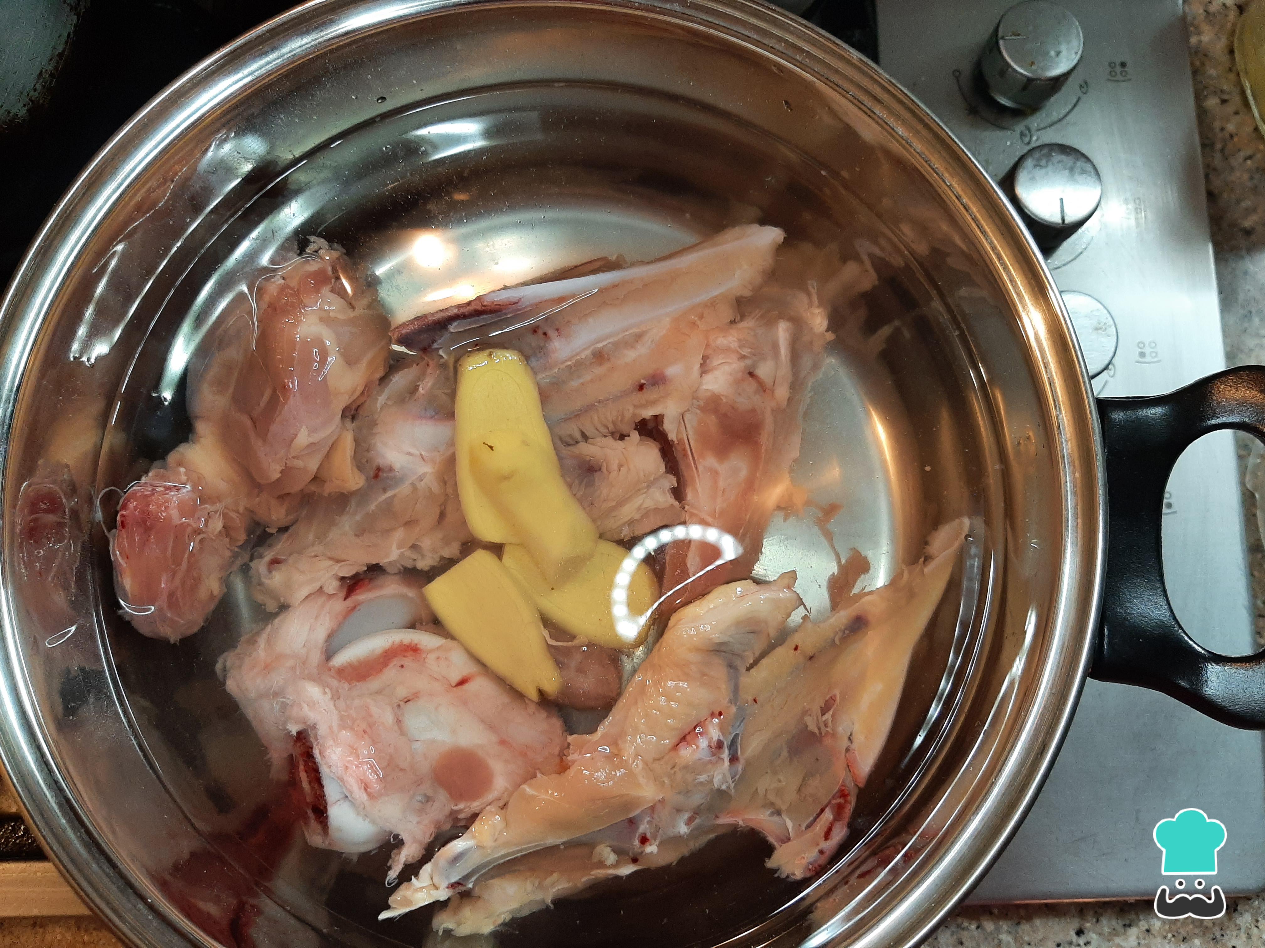 En una olla mediana, coloca los huesos de pollo y los huesos de cerdo. Agrega agua hasta que cubra completamente los huesos. Añade el jengibre y hierve todos los ingredientes aproximadamente unos 20 minutos. Con una espumadera retira las impurezas del fondo, estas se pegan en las paredes de la olla o se encuentran en la superficie del fondo.