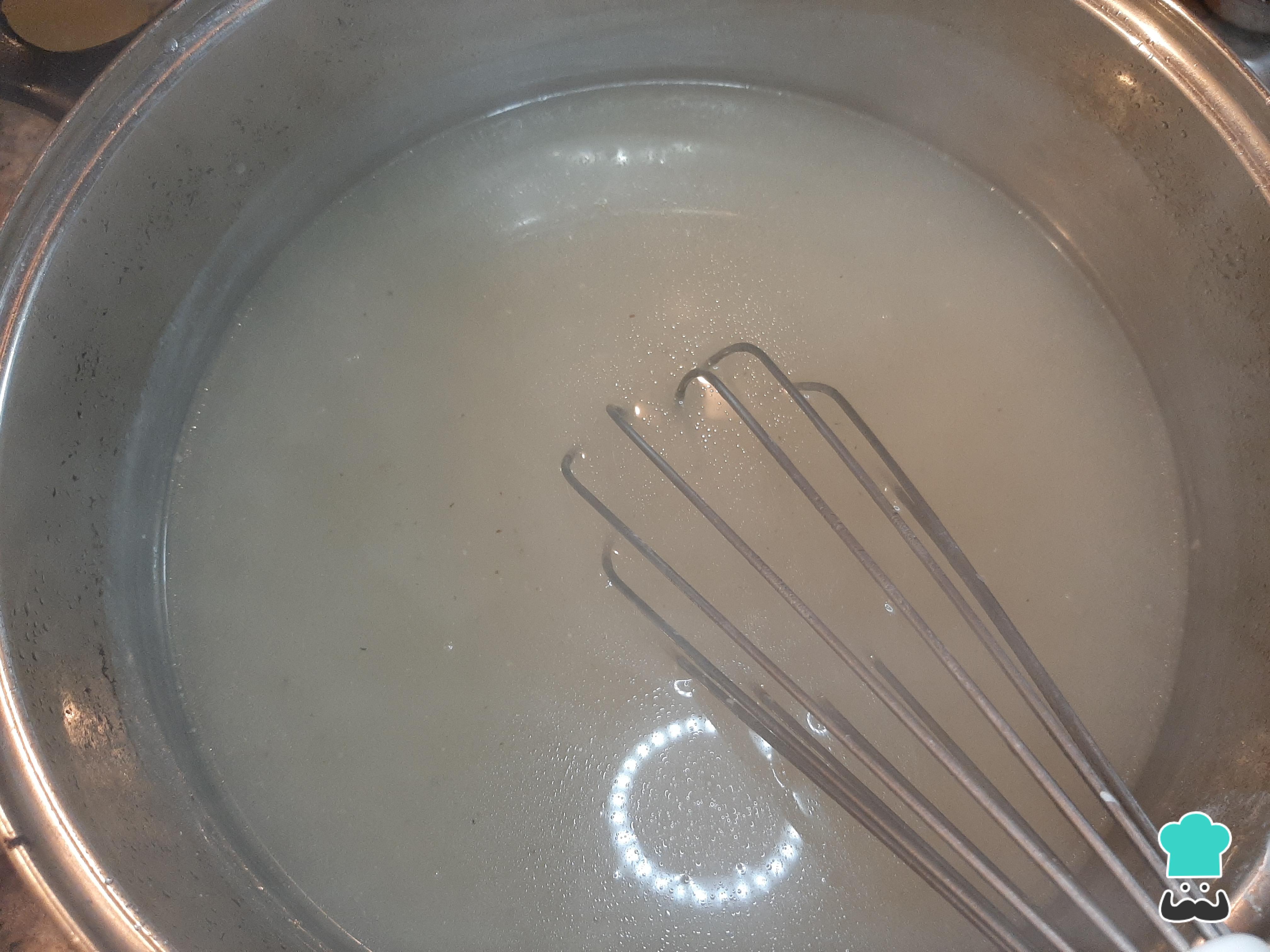 Disuelve la maicena con una cuchara en agua fría. En la olla donde se encuentra el fondo a fuego medio, incorpora la maicena en forma de hilo y cocina hasta que comience a espesar. Es importante no dejar de mover, de lo contrario, se podrían formar grumos.