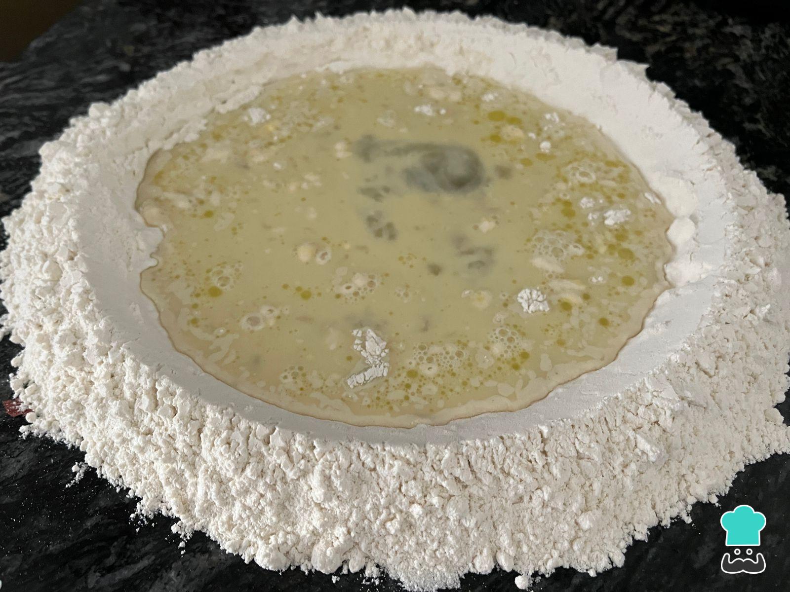 Para empezar con la preparación de los sorrentinos a la crema arma una corona con la harina en una mesada limpia o recipiente. En el centro, añade el huevo, el aceite y el agua. Integra del centro hacia afuera para formar una masa y amasa hasta obtener una consistencia homogénea y lisa.