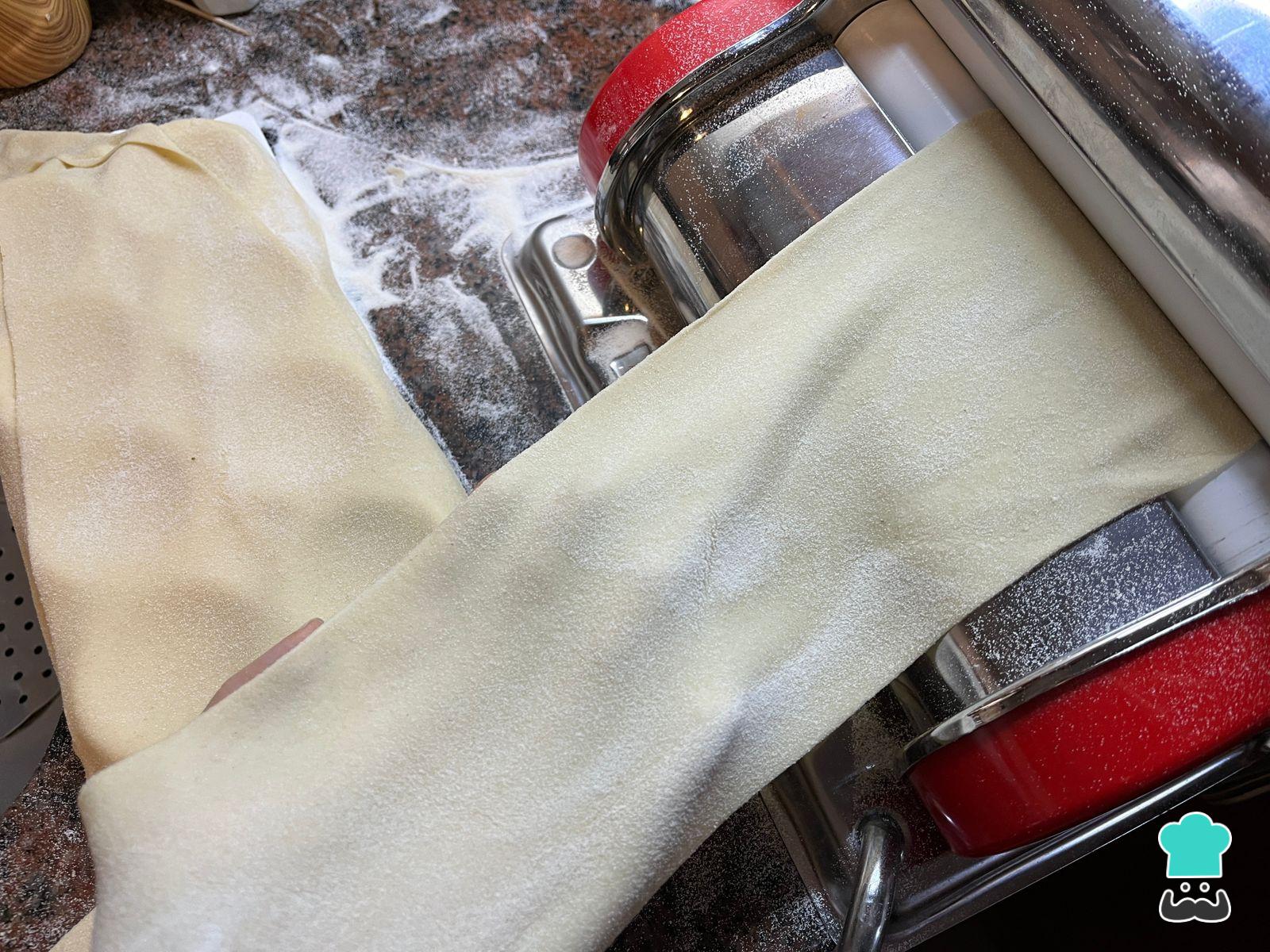 Pasado ese tiempo, divide la masa en 4 estírala en una sobadora agregando harina cada vez hasta llegar al punto 7 u 8.