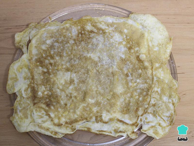 Ahora, en tanto se enfría el arroz para sushi, hacemos nuestro original sustituto del alga nori: una tortilla francesa hiperplana que hacemos durante 2 minutos en una plancha rectangular. Vuelta y vuelta.
