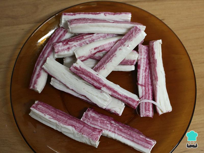 Picamos los palitos de cangrejo con los que vamos a rellenar nuestro especial sushi sin alga nori o mejor dicho, nuestro sushi con tortilla de huevo.