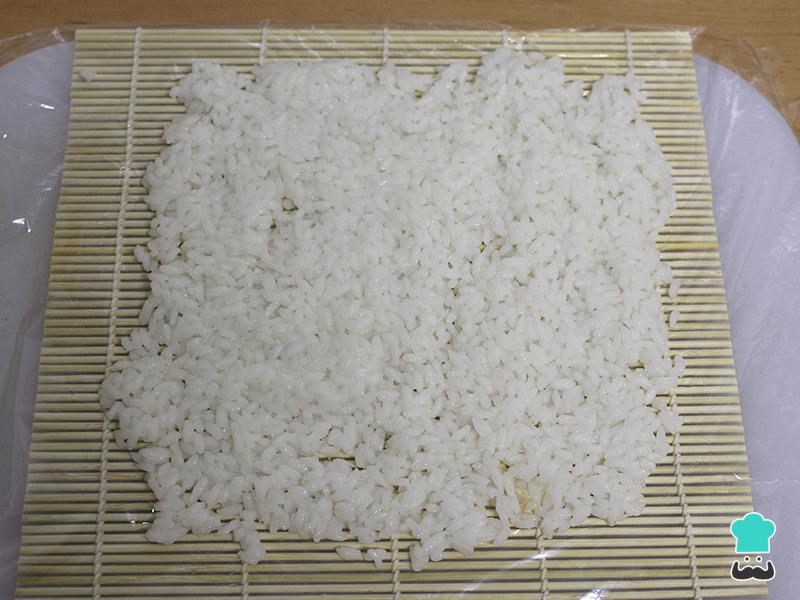 Extendemos el arroz sobre la esterilla y un film transparente para que no se pegue a ésta el arroz.