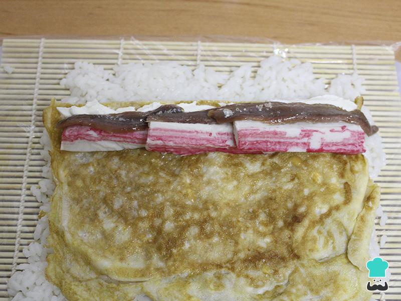 Una vez hemos extendido el arroz sobre la esterilla, ponemos el resto de ingredientes para formar el sushi. Entonces, disponemos nuestra tortilla-alga nori, y sobre ésta, al inicio del roll futuro de sushi, el queso crema, los palitos de cangrejo y las anchoas bien escurridas.