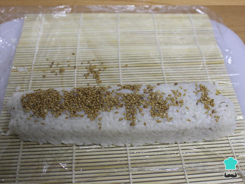 Enrollamos poco a poco el sushi con la ayuda de la esterilla y los dedos. Una vez completado, estiramos el film transparente, espolvoreamos el sésamos sobre el roll de sushi y un poco también sobre la parte más próxima del film y volvemos a apretar para que el sésamo quede pegado al arroz.
