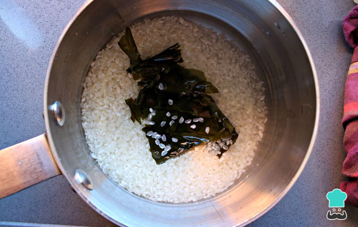 Calienta el cazo a fuego alto hasta que comience a hervir, entonces retira el alga, tapa la olla y continua con la cocción a fuego bajo por 10 minutos. Pasado este tiempo, retira del fuego y deja reposar el arroz para sushi unos 15 minutos.