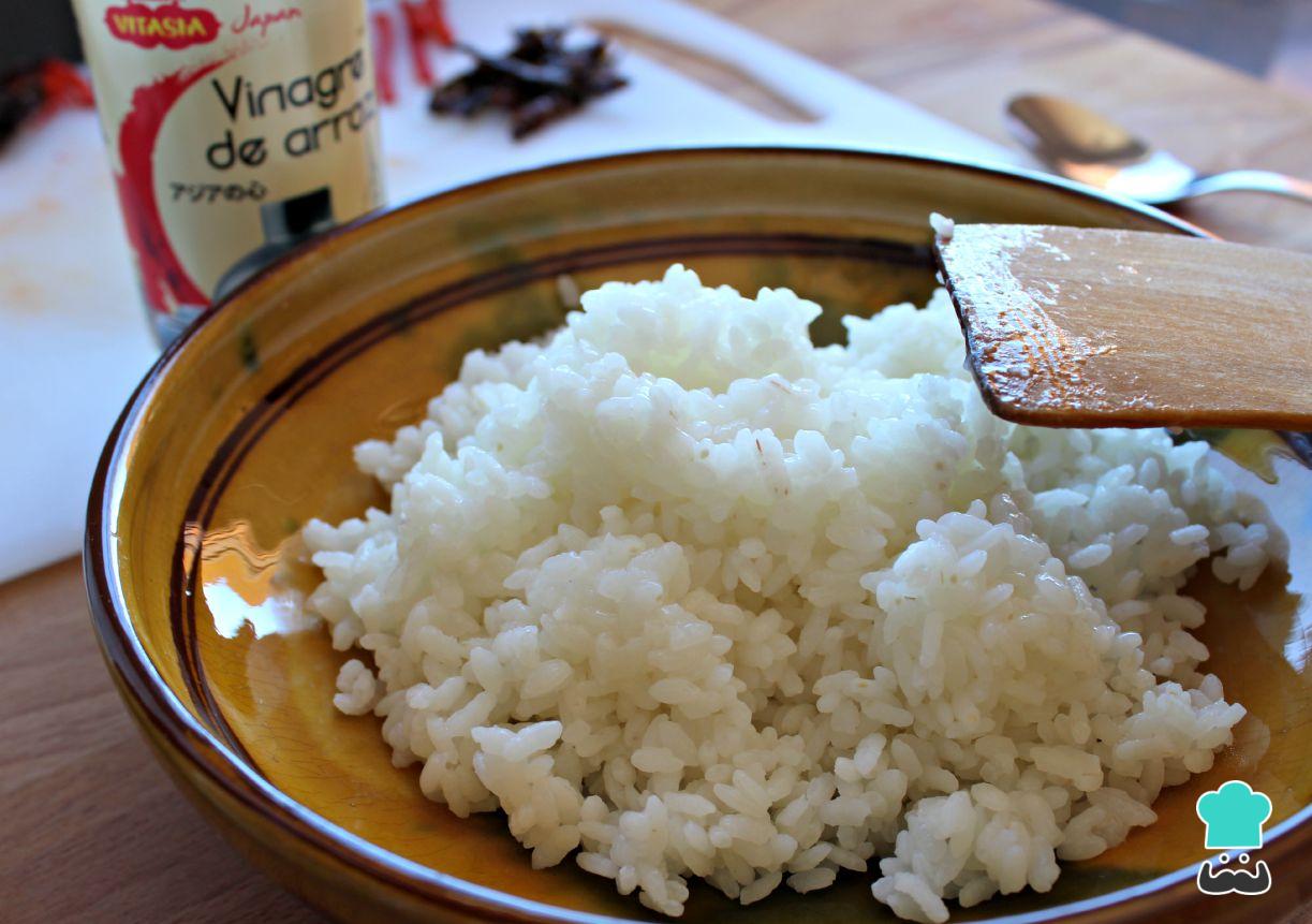 Para terminar con el arroz para sushi, coloca todo en un bol amplio y añade el vinagre. Remueve utilizando una cuchara de madera, con movimientos rápidos pero delicados, intentando no romper los granos de arroz.