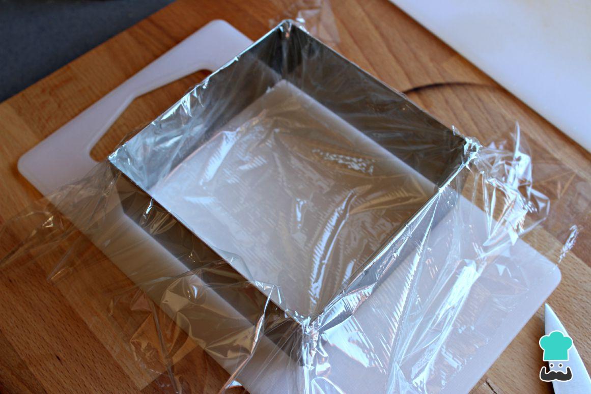 Para hacer el prensado necesitarás un molde de emplatado cuadrado como se ve en la fotografía y par de cartones de la misma medida del molde que usaremos para presionar. Coloca el molde sobre una superficie plana y cúbrelo con papel transparente que sobresalga por los lados.