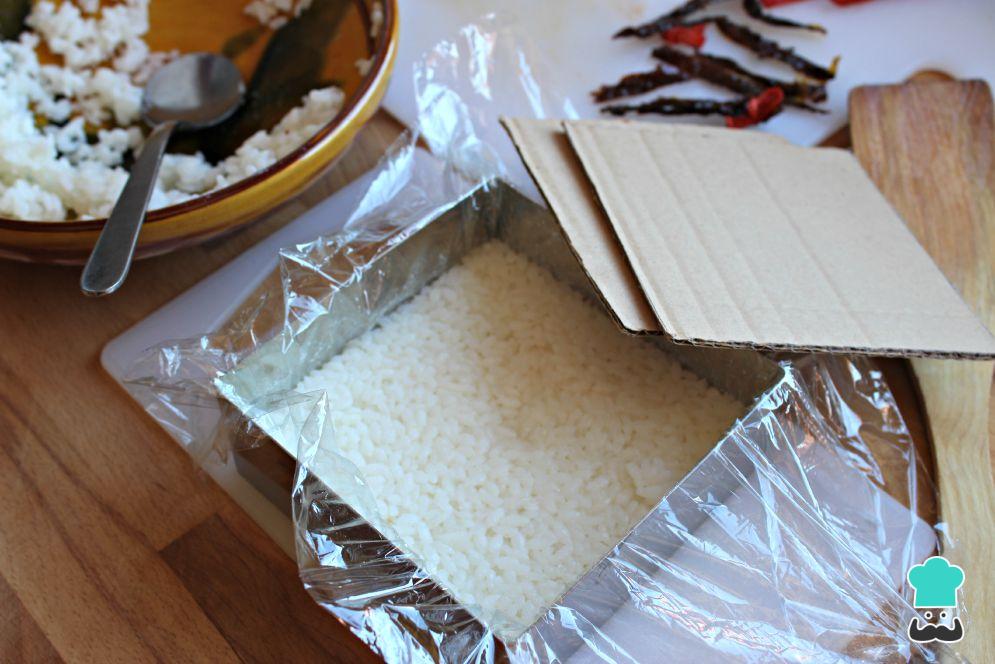 Para terminar, vuelve a cubrir todo con papel film y presiona con los moldes de cartón. Coloca encima algo de peso y deja reposar el sushi en la nevera una media hora para que compacte bien.
