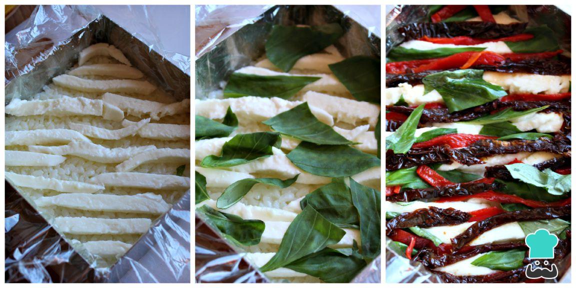 Retira el sobrante del papel transparente, añade un chorrito de aceite y coloca los ingredientes del relleno cortados en tiras finas. Coloca primero la mozarella, luego las hojas de albahaca y por último los pimientos y el tomate.