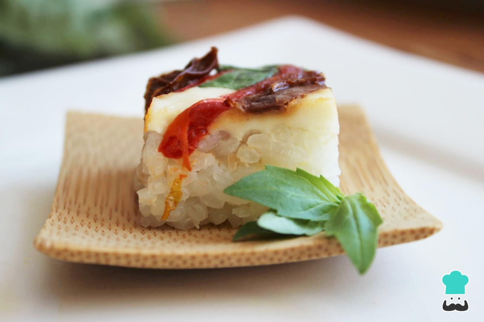 El sushi es una delicia de la cocina japonesa que se ha puesto muy de moda en el mundo entero. En una adaptación de este popular plato a la cocina mediterránea hemos querido alterar los ingredientes clásicos y utilizar tomate seco, pimientos y queso para hacer un sushi vegetariano que no tiene nada que envidiar al típico sushi de salmón. Sigue esta receta paso a paso de nuestros amigos de Sabor en Cristal y disfruta de un plato único y original.
