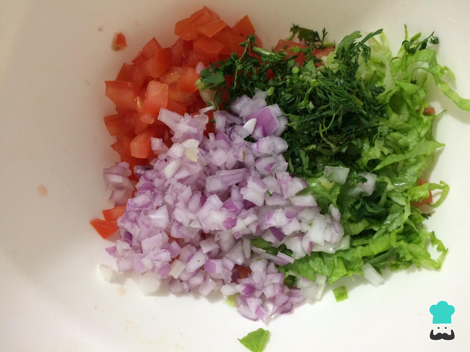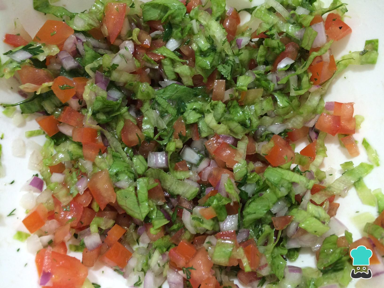 En un bol mezclar el tomate sin semillas, la cebolla cortada en cubos pequeños, el cilantro cortado finamente y la lechuga cortada en tiras.