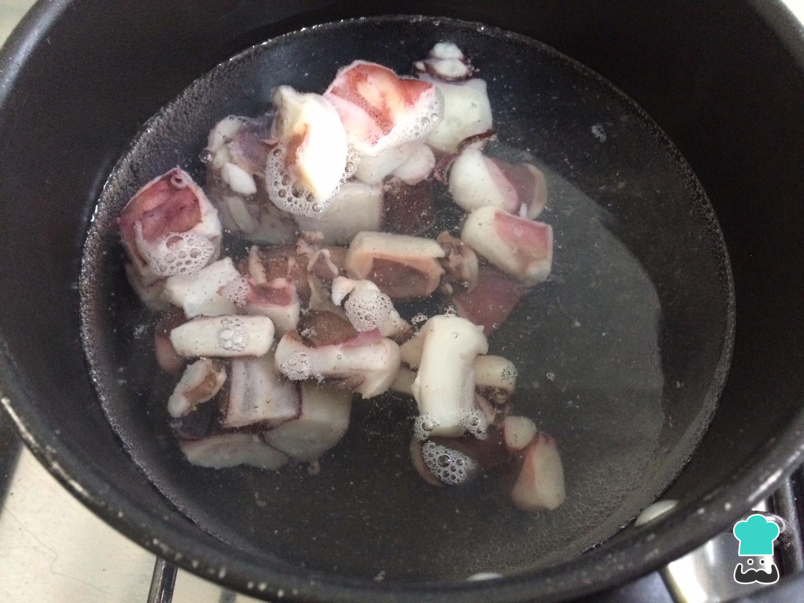 Cocinar el pulpo cortado en cubos pequeños en agua hirviendo con sal, durante 20 minutos. Recuerda que también puedes usar pulpo ya cocido como en la receta de tacos de pulpo.