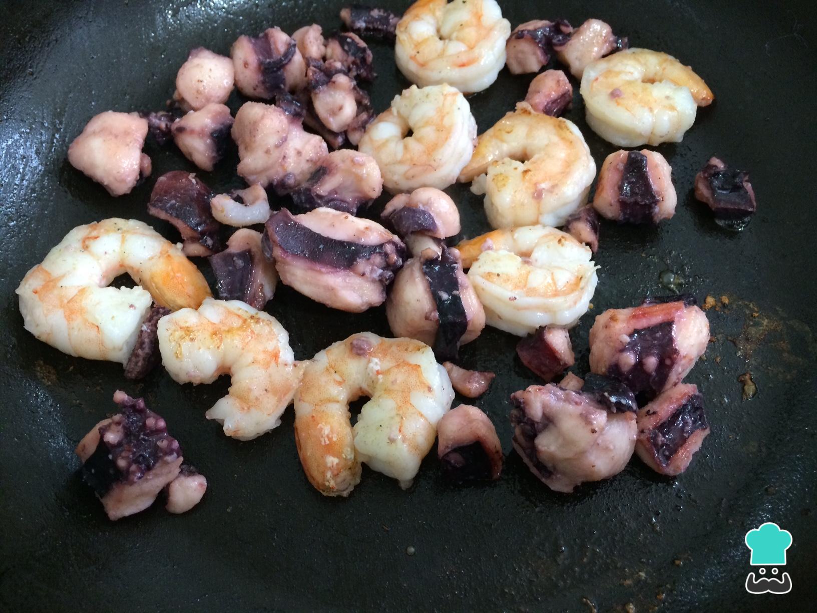 Aparte, en una sartén con aceite, cocinar los camarones salpimentados hasta que estén dorados. Entonces, agregar el pulpo cocinado y unas gotas de jugo de limón, saltear unos minutos más.