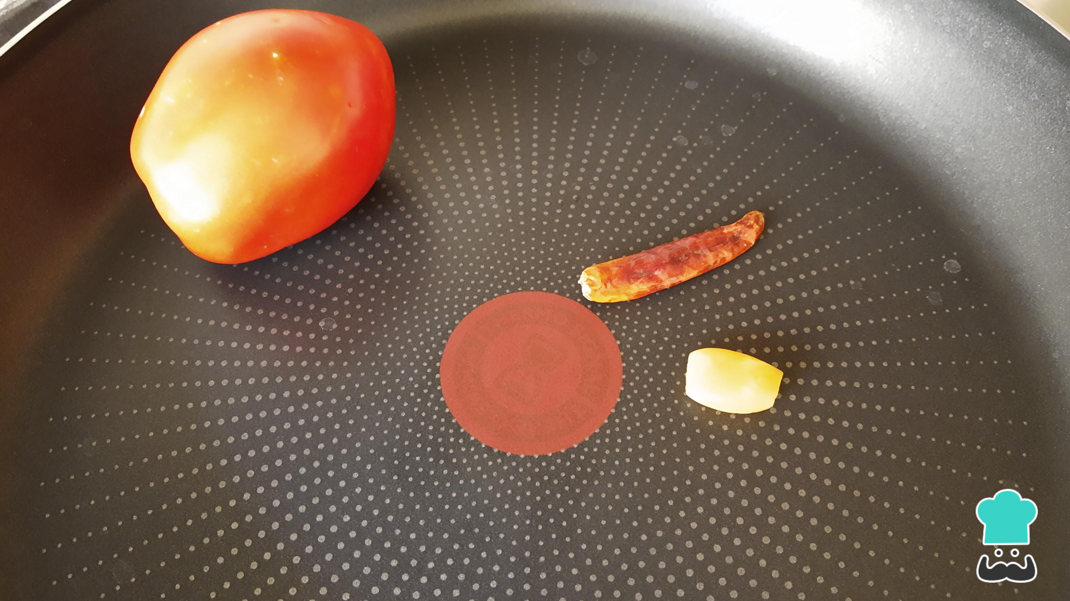 Para empezar con la receta de tacos de pollo desmenuzado, primero en una sartén o comal debes asar el tomate, el diente de ajo y el chile de árbol. Debes vigilar que este último no se queme, cuando todo esté tostado, retira del comal y reserva.