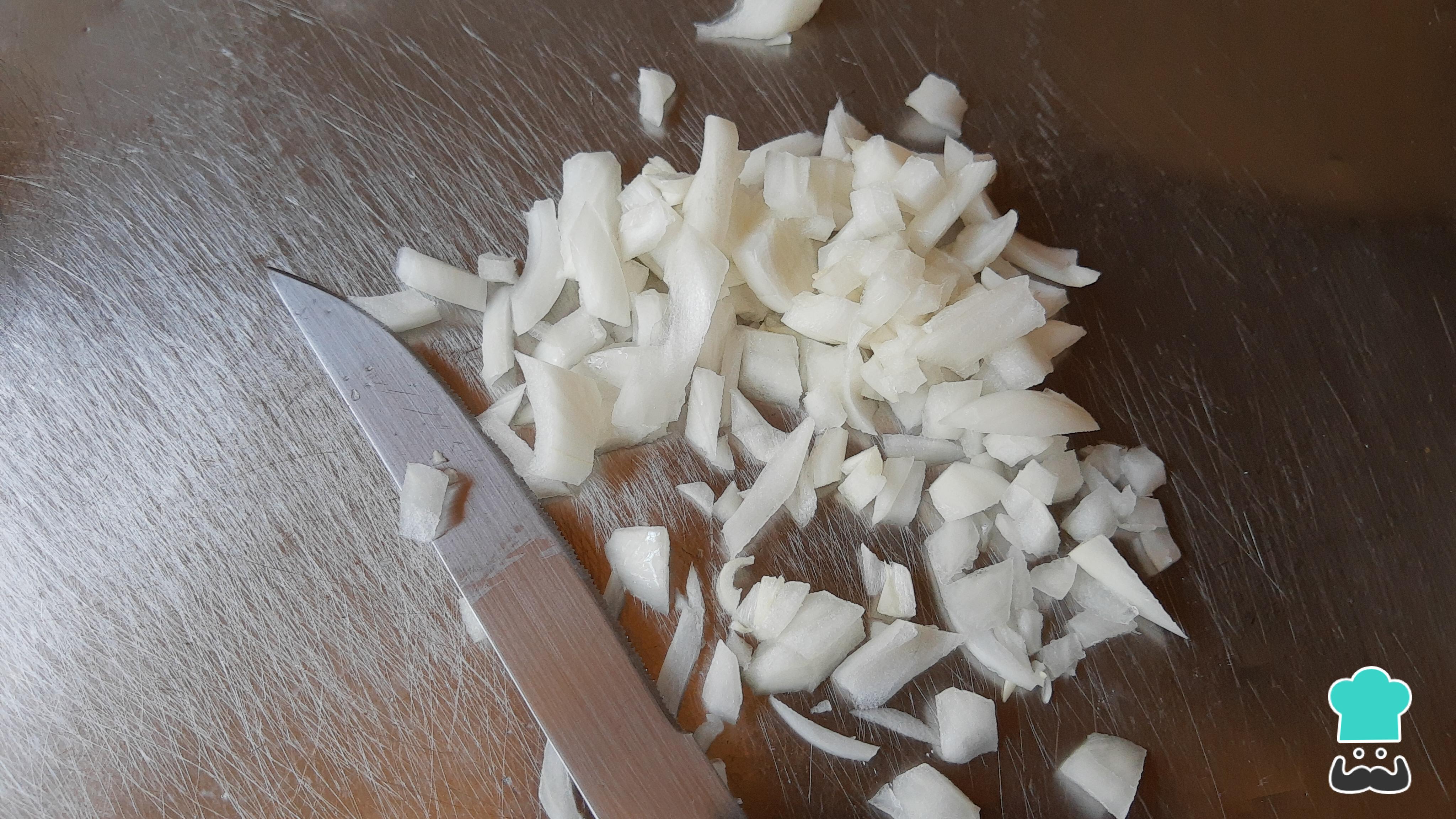 Pica finamente la cebolla, ya sea en cuadritos o en julianas. Luego, reserva.