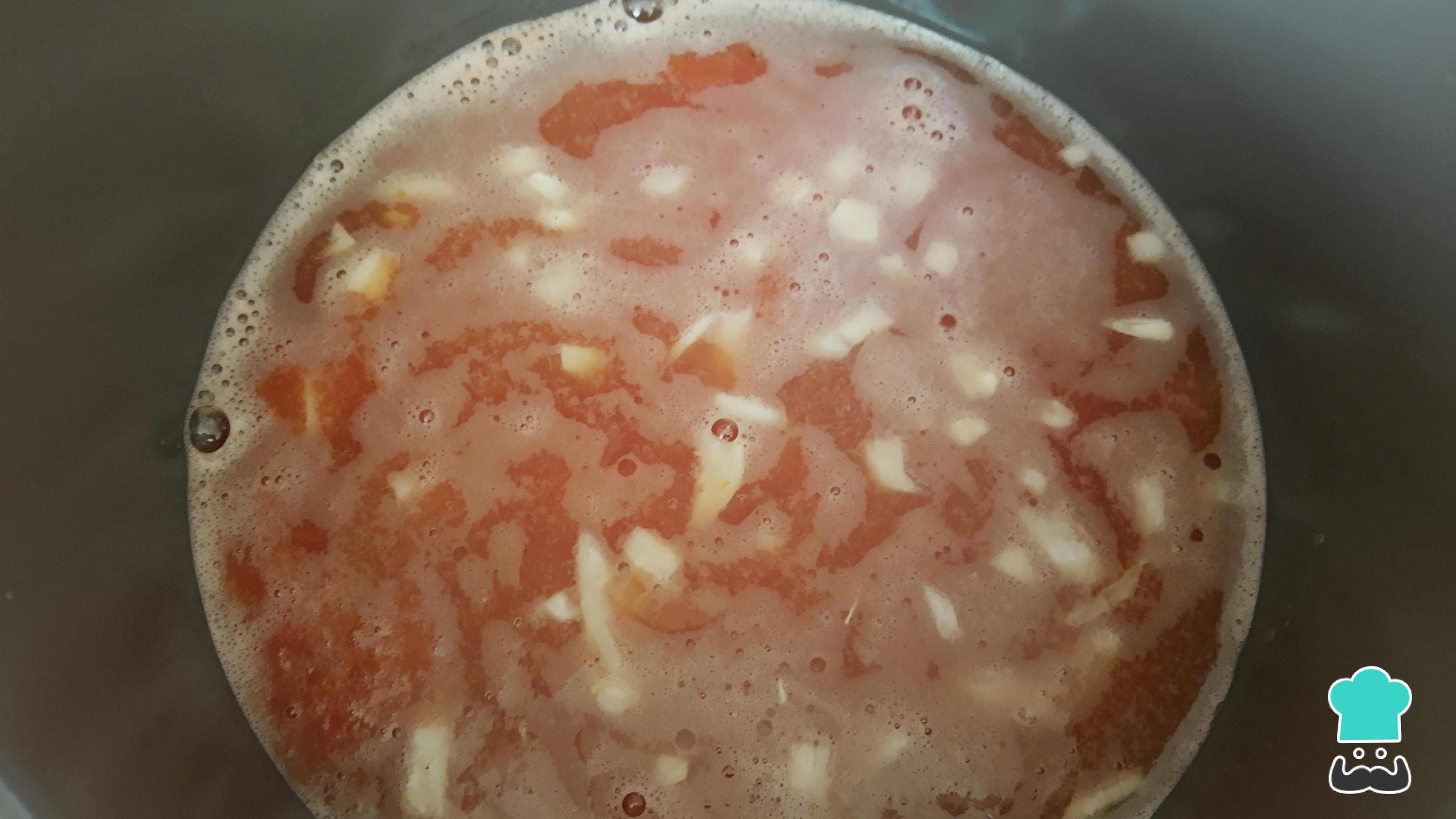 En la licuadora coloca el tomate, el diente de ajo, el chile de árbol, la sal, la pimienta al gusto, la pizca de comino, las 2 hojitas de laurel, el puré de tomate y una taza de agua, licúa todo durante 3 minutos.
